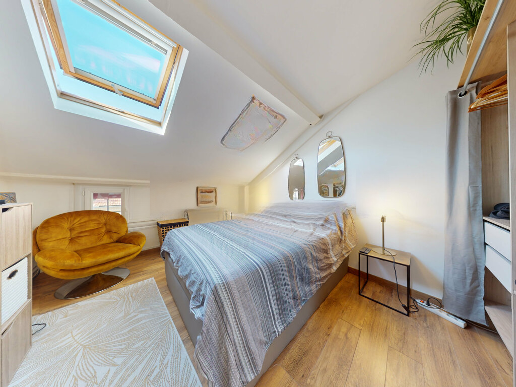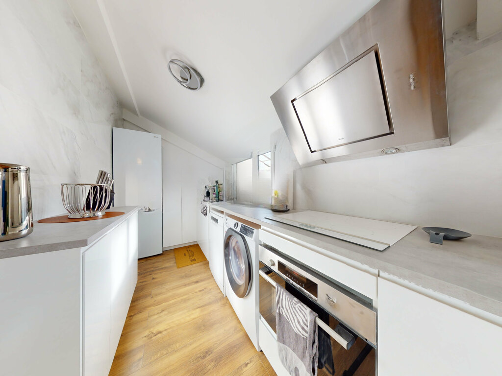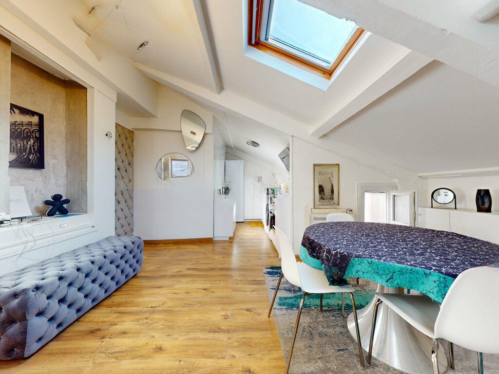 Апартамент расположен на последнем этаже без лифта и оснащен великолепными мансардными окнами. Среди ключевых особенностей — современная кухня, объединенная с гостиной и столовой зоной, две спальни и ванная комната с душем и туалетом.