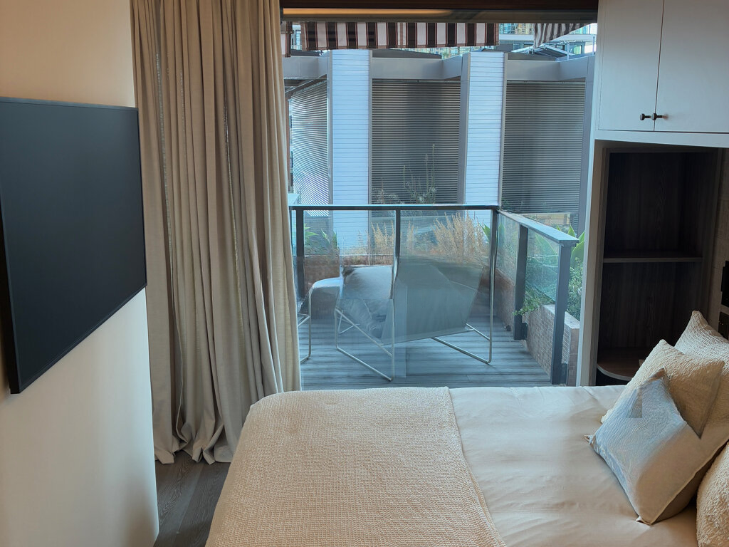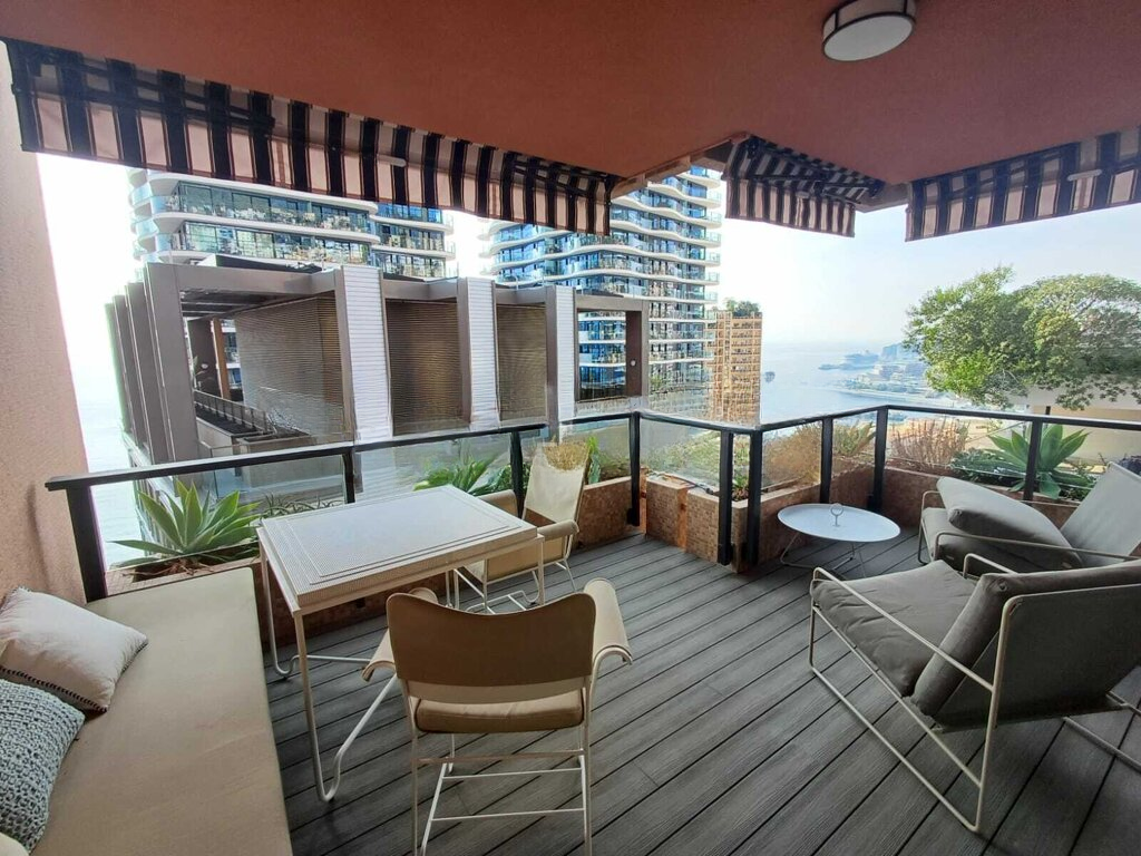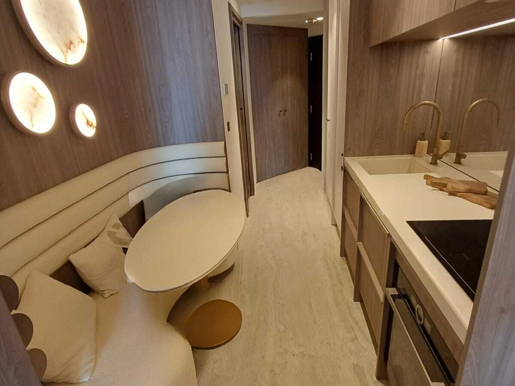 Квартира предлагает вид на море и включает в себя прихожую, гостевой туалет, оборудованную кухню, зону отдыха с обеденной зоной, спальную зону, душевую комнату и террасу площадью 18 м².
