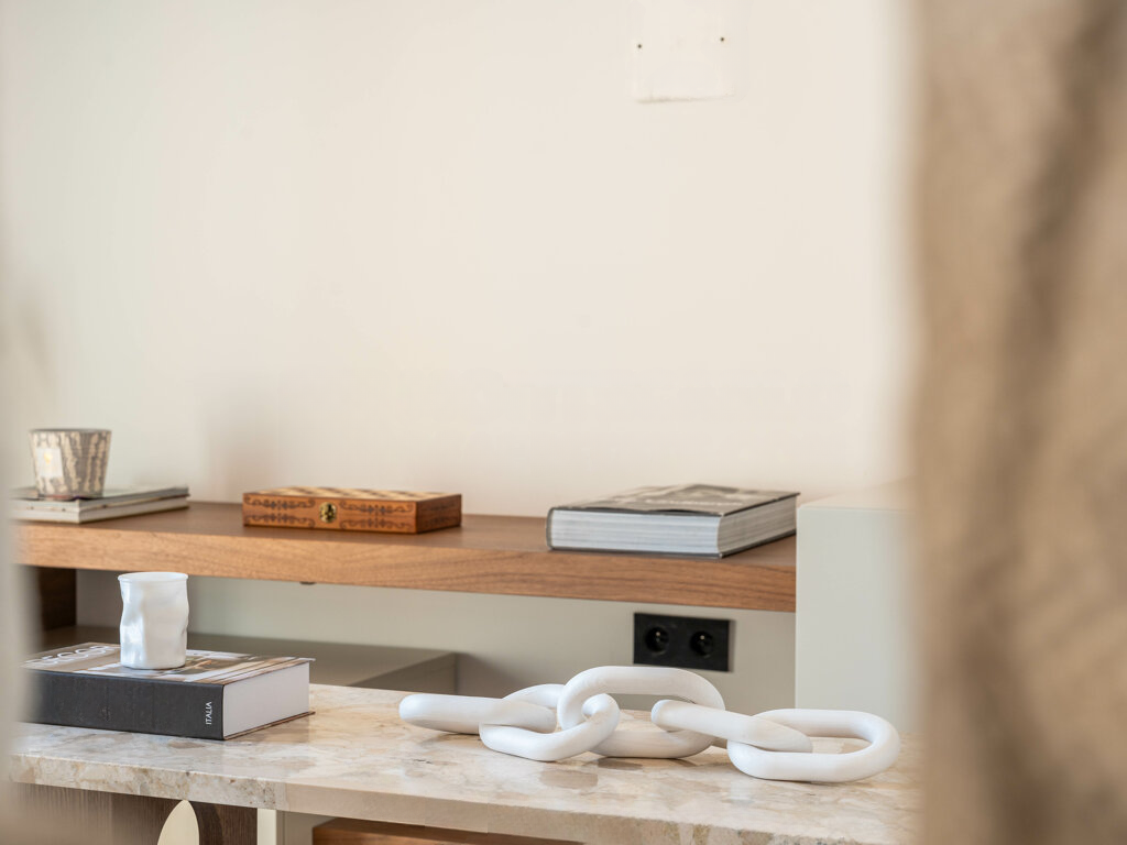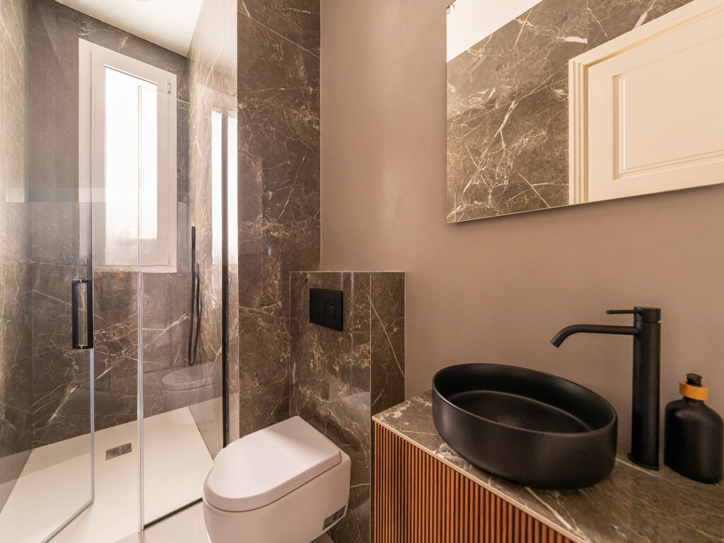 Общая площадь составляет 84 м², включая светлый салон с открытой кухней, две просторные спальни с гардеробами и две душевые комнаты, а также дополнительный туалет для гостей.