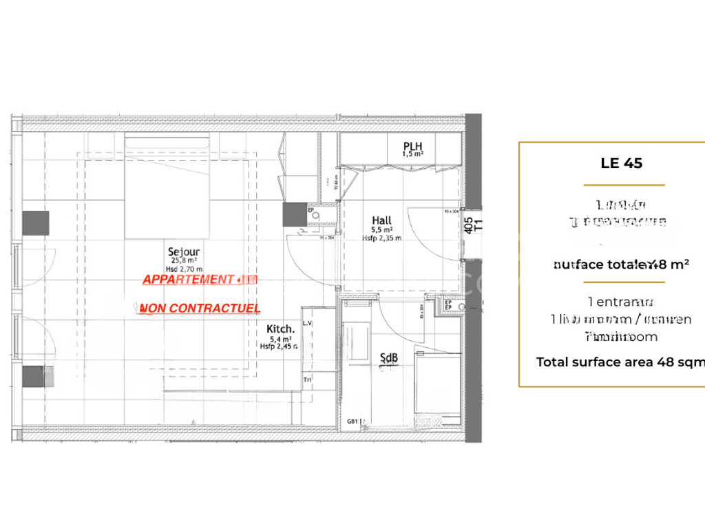 Апартамент площадью 48 м² находится на 4-м этаже и имеет панорамный вид на город. Главная комната светлая и просторная, с большой угловой кухней, полностью оборудованной техникой от BULTHAUP. В прихожей расположены многочисленные шкафы для максимального использования пространства, а душевая комната функциональна и комфортна.