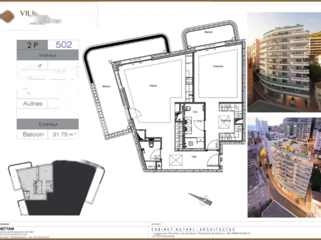 Апартамент включает в себя главную спальню с гардеробной, выходящей на приватную террасу. В ванной комнате предусмотрены двойная раковина, туалет и душ. Из гостиной с встроенными и освещёнными шкафами и открытой кухней ведёт выход на большую угловую террасу в 31 м² с восхитительными видами на море, город и горы.