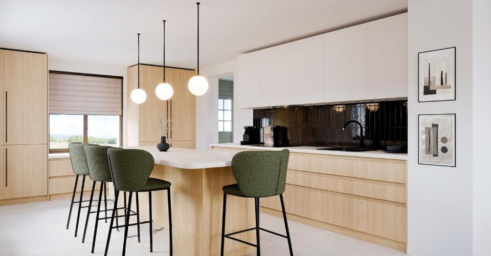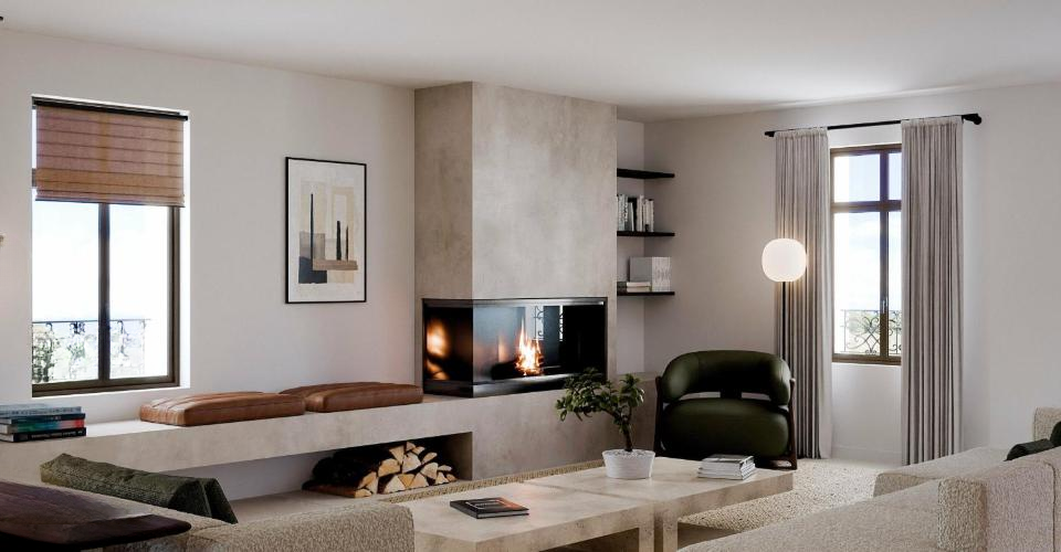 Сердце дома — это просторная гостиная площадью 56 м², затопленная естественным светом благодаря большим оконным решеткам. Помещение украшают г-образный стеклянный камин M-DESIGN и элегантная стена из гладкого бетона, создающие обволакивающий визуальный комфорт.