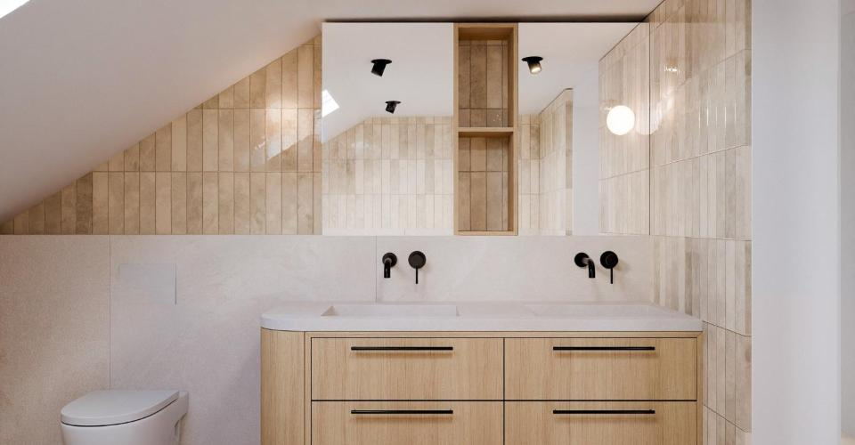 На верхнем этаже царит спокойствие. Главная спальня 24 м² окутывает атмосферой умиротворения, имеет гардеробную и личную ванную комнату, затопленную светом через удачно размещенное мансардное окно.