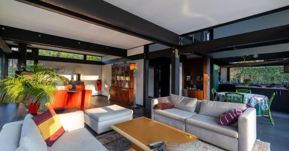 Дом распределен на трех уровнях с полезной площадью 321 м² и привлекает щедрыми объемами и вездесущим светом. На первом этаже располагается большая полуоткрытая кухня, офис, залитый светом благодаря большим окнам, гостевой туалет, а также обширное жилое пространство, открытое к наружу и саду.