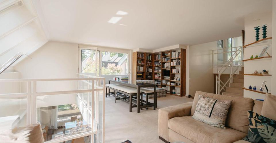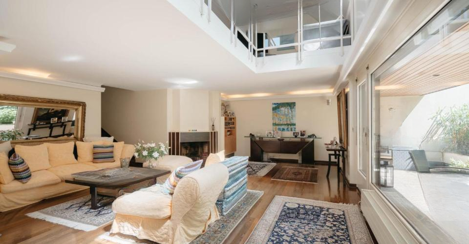 Эта квартира-дуплекс с 5,5 комнатами находится в кондоминиуме площадью 227 м² с террасами общей площадью 116 м². Она включает в себя вход с местом для хранения и просторную, очень светлую гостиную с камином, которая выходит на балкон, рядом с отдельной и полностью оборудованной кухней.