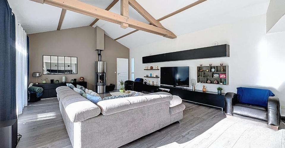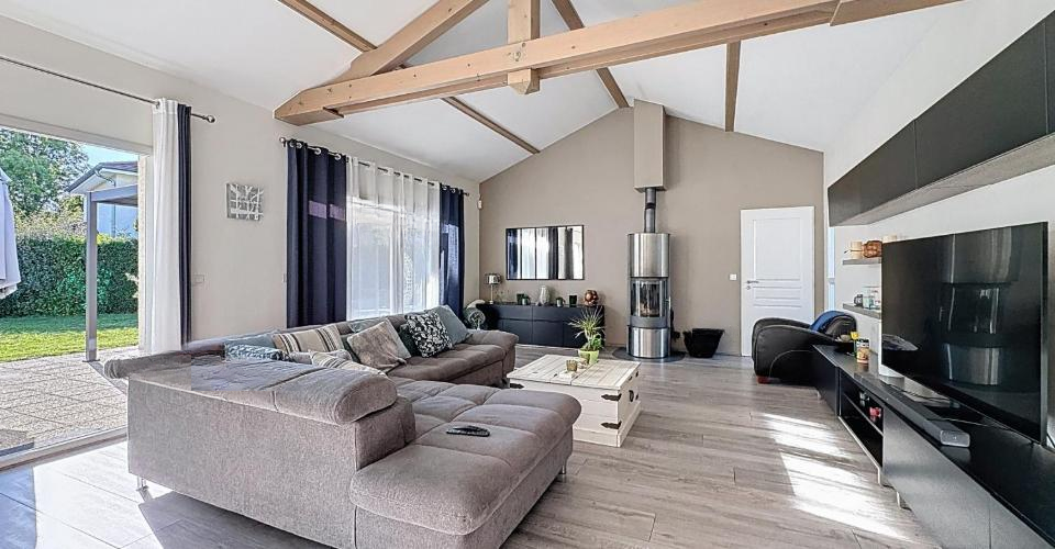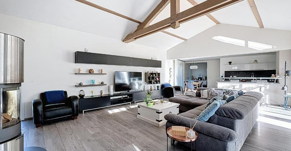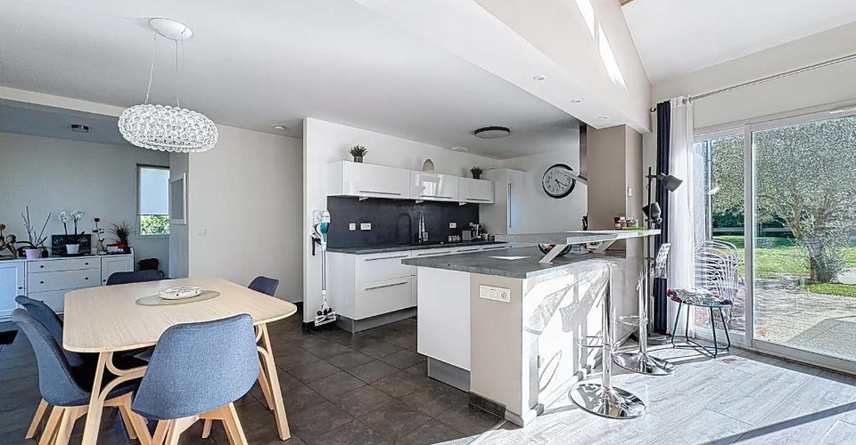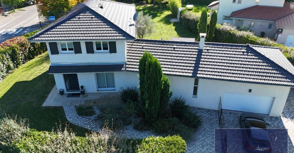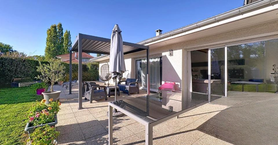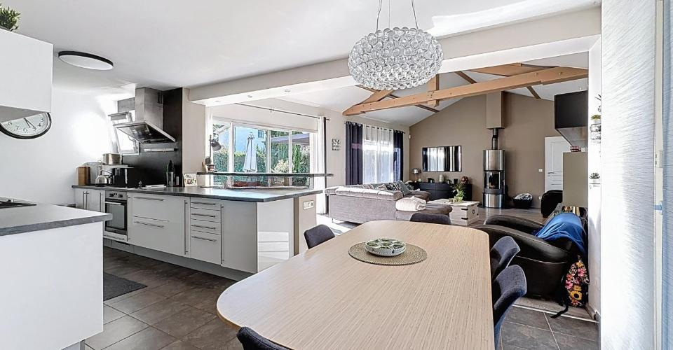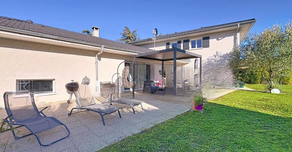 Предлагаем вашему вниманию великолепную виллу, разработанную архитектором, в Chens-sur-Léman, Франция. Жилая площадь составляет 152 кв. м, а общая площадь — 241 кв. м. Дом был построен в 2011 году на участке площадью 1674 кв. м. Вас встречает входной холл с гардеробной и отдельным туалетом, ведущий в жилую зону с полностью оборудованной кухней и барной стойкой для завтраков. Просторная столовая/гостиная с дровяной печью занимает 57 кв. м и впечатляет своими пропорциями благодаря потолку 'собора'. Большие окна зоны открываются на террасу, заполняя помещение естественным светом.