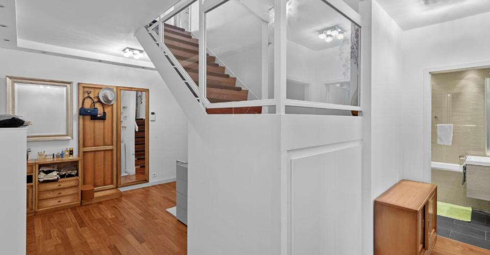 Расположенная в ухоженном высококлассном здании с лифтом, построенном в 1985 году и полностью отремонтированном в 2012 году, квартира отличается изысканной отделкой и качественными материалами, создающими современную и при этом уютную атмосферу. Распределённая на двух уровнях, эта светлая, снабжённая двойным выходом территория имеет функциональную планировку с двумя независимыми входами. Два балкона увеличивают жилое пространство и открывают вид на зелёные окрестности.