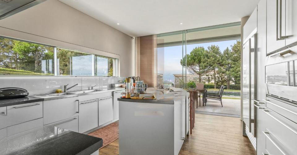 На первом этаже находятся: гостевой туалет, просторная полностью оборудованная кухня Bulthaup, большая столовая, смежная с просторной гостиной комнатой, кабинет и тихая терраса из тика площадью 85 м² с бассейном, лаунж-зоной и беседкой с видом на озеро.