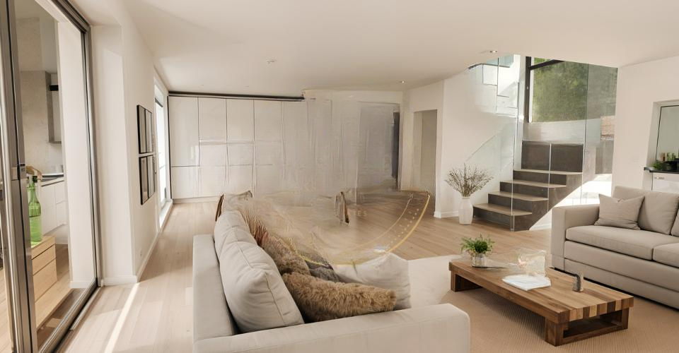 Первый этаж площадью 75 м² будет включать просторную, светлую гостиную 55 м² с камином и прямым выходом на террасу 44 м², идеальную для наслаждения солнечными днями и приема близких.