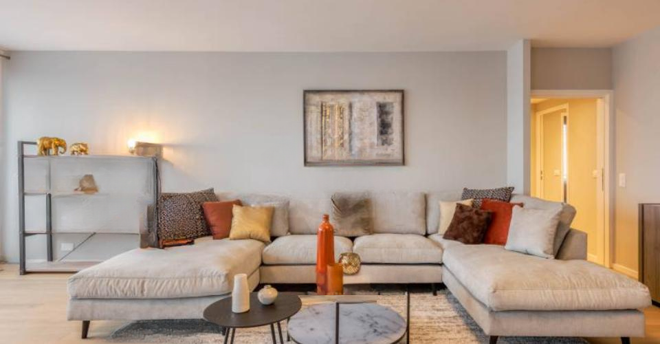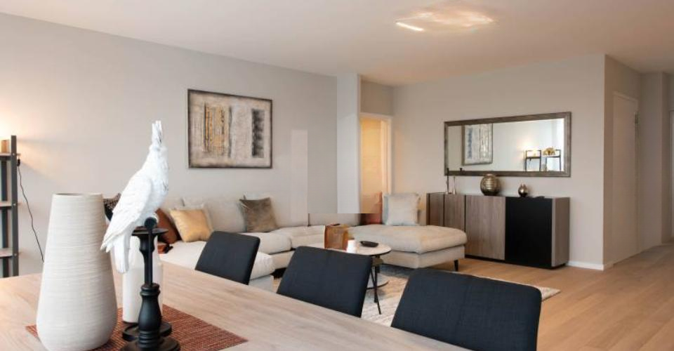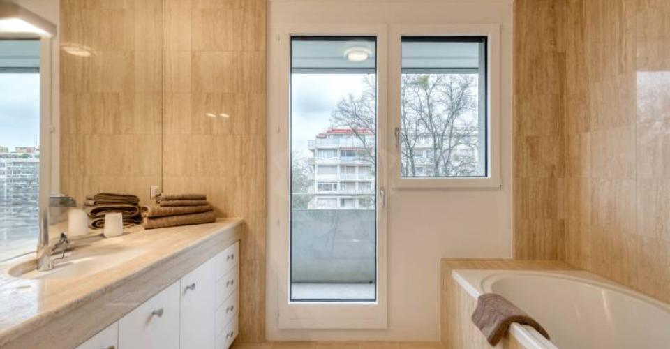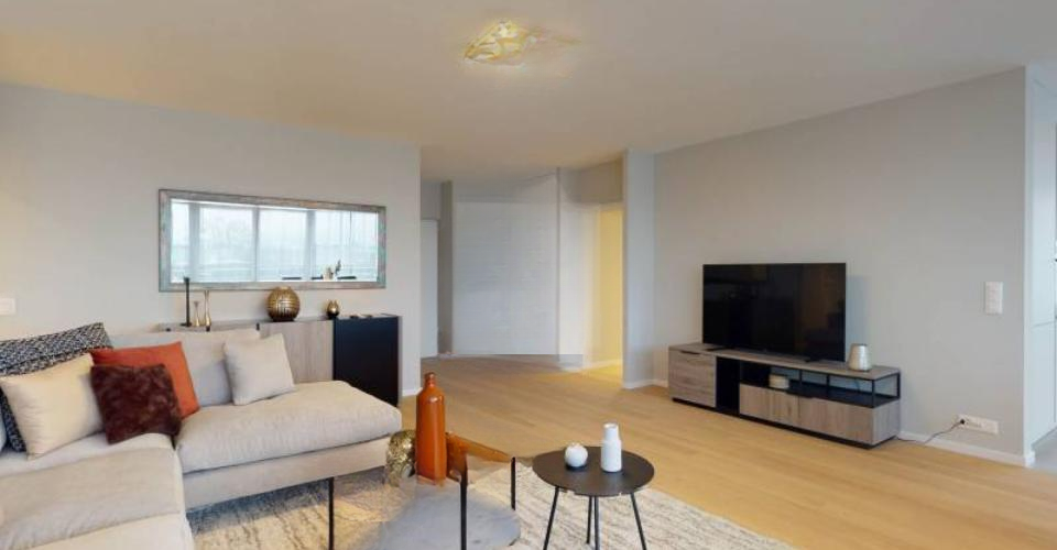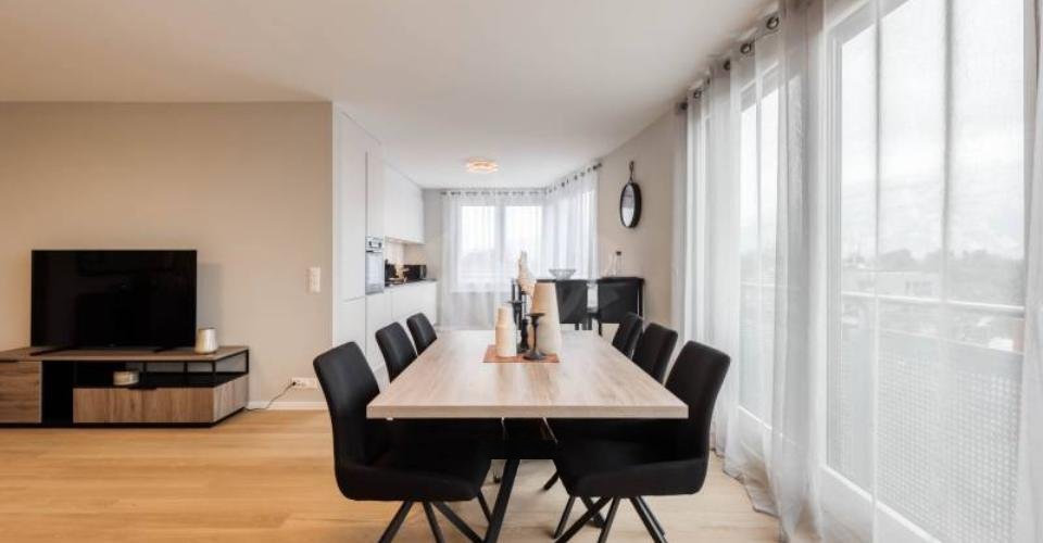 С общей площадью 163,5 м², квартира дополнена 21,4 м² балконов. Вход через частный лифт ведет в просторную гостиную с большими панорамными окнами, открывающими вид на гору Salève. Эта комната включает элегантную гостиную/столовую и полностью оборудованную современную кухню открытого плана.