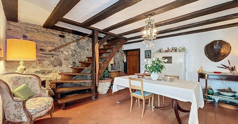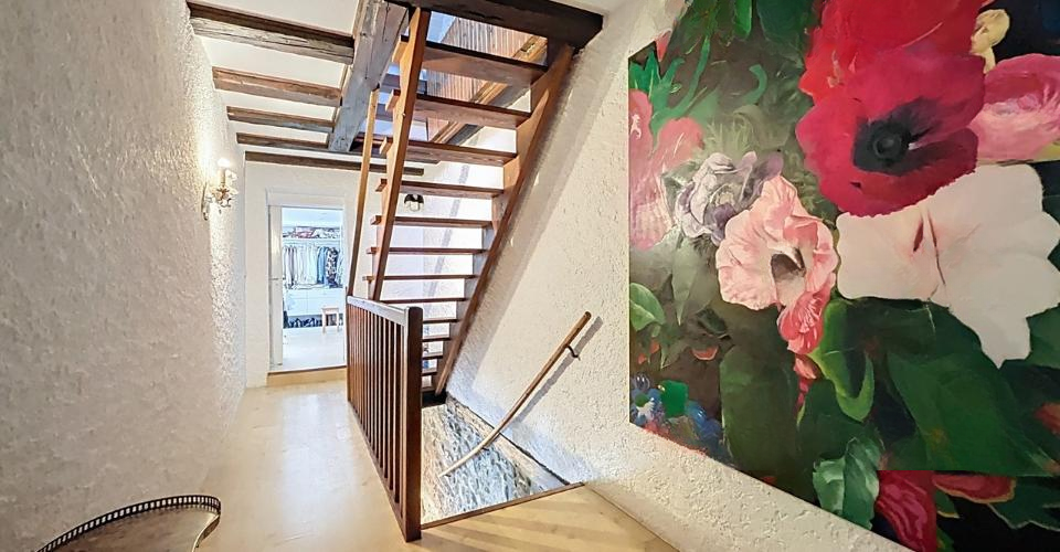 Главный дом состоит из следующих помещений: на первом этаже — прихожая со столовой с открытыми балками, гостиная с камином, отдельная кухня, гардеробная и гостевой туалет, подвал с прилегающим гаражом и доступ к пространству, напоминающему амбар, с большими возможностями для развития. Имеется два сада, доступные с разных сторон дома, площадью 100 м² и 140 м². Также есть большая парковка, прилегающая к собственности, вмещающая 5-6 автомобилей, и второй закрытый гараж с доступом к обустроенной мансарде.
