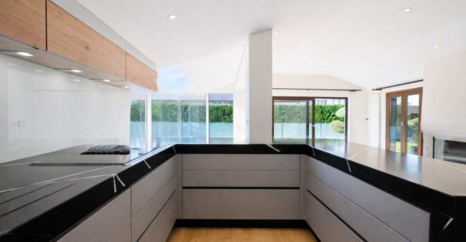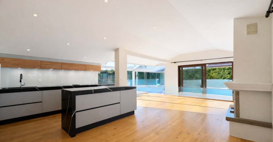 На верхнем уровне находится просторная гостевая зона с камином и открытой кухней, с прямым выходом в сад и к бассейну. Верхний этаж включает три спальни и ванную комнату.