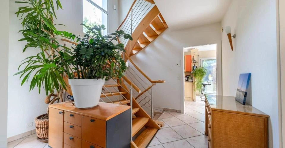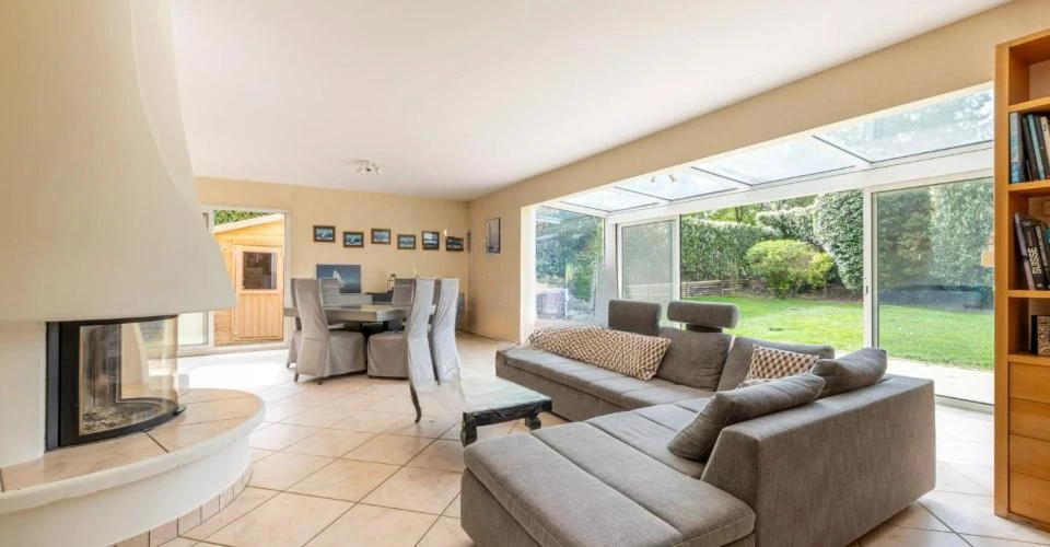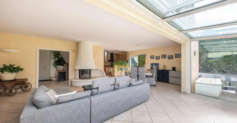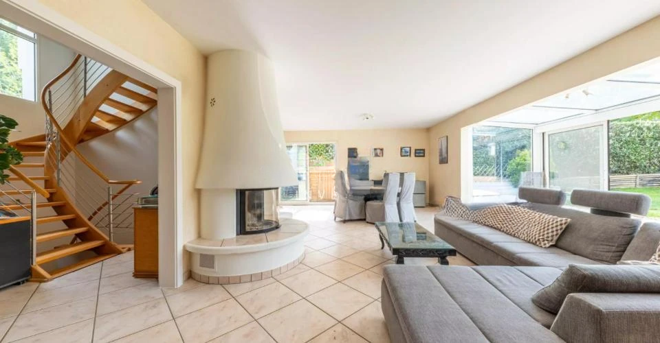 Дом построен на красивом участке площадью 750 м² и предлагает щедрое пространство приблизительно 230 м². Вас покорит просторная, наполненная светом гостиная с большим камином, которая открывается на полностью оборудованную кухню и столовую зону. Из гостиной есть выход на террасу и красивый, плоский огороженный сад, обеспечивающий полную уединенность. На этом уровне также находится гостевой туалет.