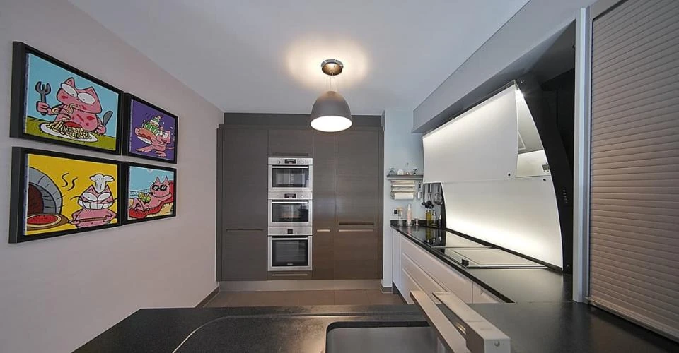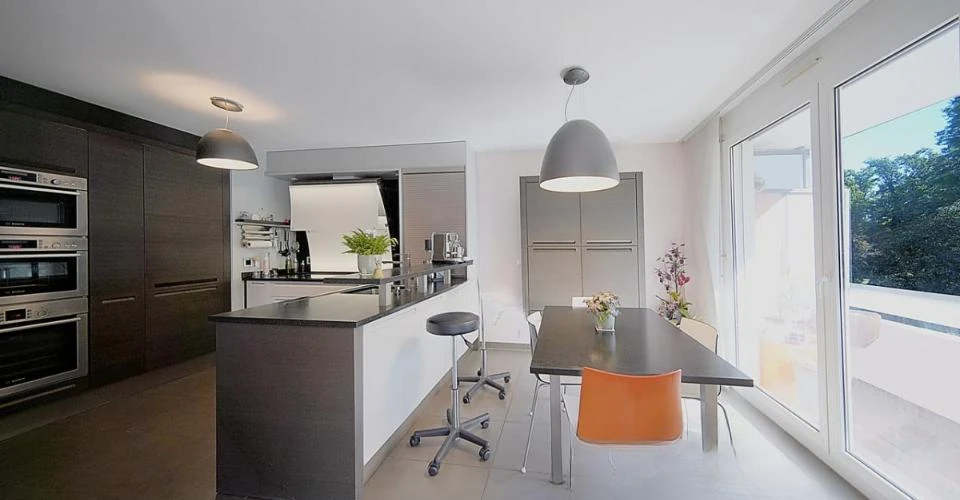 - Кухня: 3 духовки (включая одну паровую), гриль тэппаньяки, барная стойка, гранитная рабочая поверхность (абсолютный черный), многочисленные шкафы, вытяжка, и т.д.