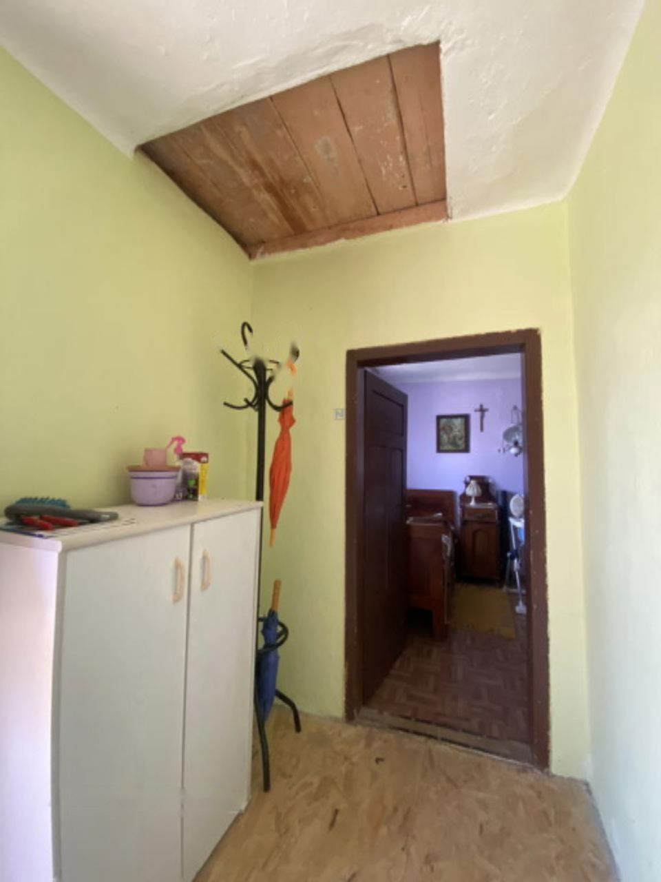 При входе вы попадете в прихожую, ведущую в комфортабельную комнату для отдыха, оснащенную печью. Центральное место в доме занимает просторная кухня с дровяной печью, создающая уютную атмосферу и в современной жизни. Кухня соединена с ванной комнатой и кладовой для хранения продуктов. Для сохранения тепла по полу проложены деревянные доски и теплый пол. Электричество и водоснабжение организованы через накопитель дождевой воды, а вдоль дороги проложена линия городского водопровода. Отопление обеспечивается дровяной печью и печью в комнате. В 2014 году установлена новая металлическая крыша, а окна обновлены два года назад, за исключением деревянного окна в кухне.