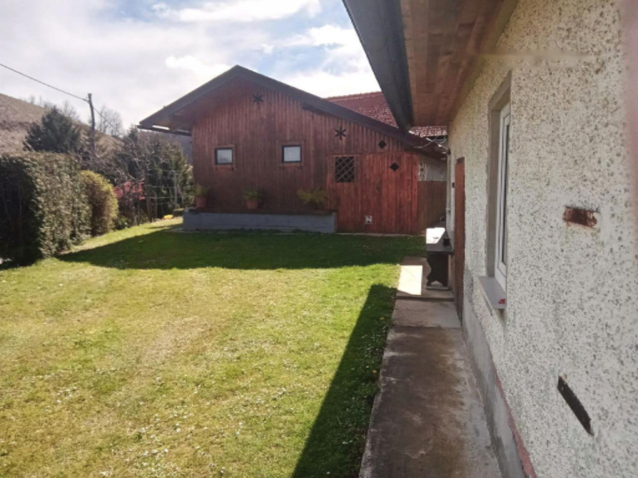 Позади дома находится старая хижина с деревянным навесом, используемая как кладовая. Под ней расположена каменная погреба, идеальная для хранения запасов и вина. Просторный земельный участок включает в себя сад площадью 1.188 м² со множеством плодовых деревьев и виноградных лоз. Небольшая часть сада подходит для строительства винного погреба или небольшого дома, получая много солнечного света благодаря юго-западной ориентации.