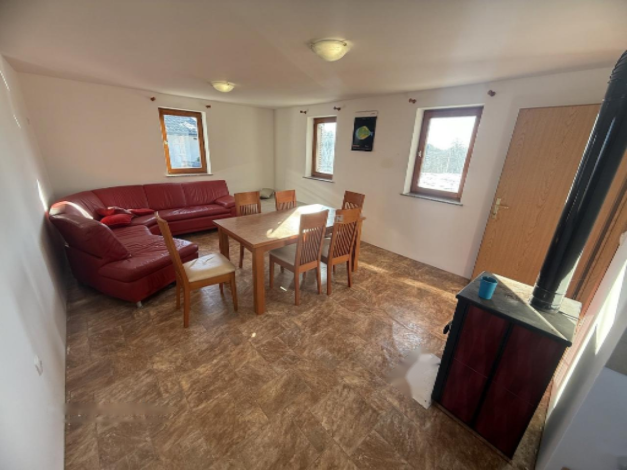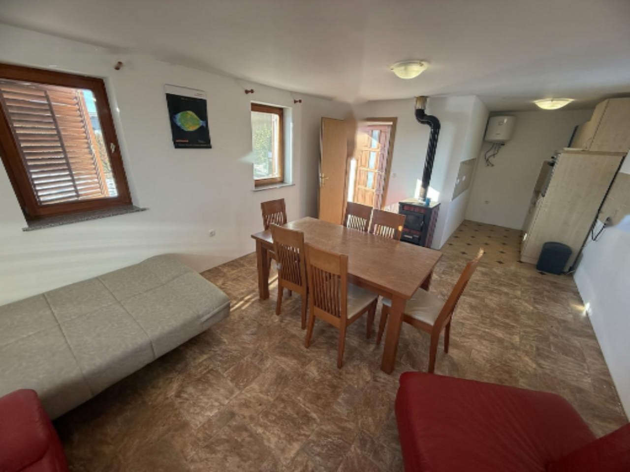 Дом находится на участке, который частично выделен под строительство, предоставляя возможность обустроить сад, террасу или другие открытые пространства. Здание выполнено из кирпича, с обновлённой черепичной крышей, что обеспечивает долговечность и надёжную защиту. Недвижимость подключена к водопроводу и электричеству, а также имеет оптическое интернет-соединение. Отопление осуществляется на твёрдом топливе, что создаёт комфорт в зимнее время.