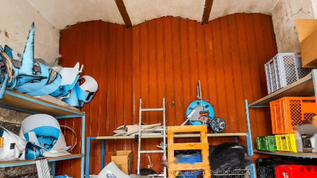 На первом этаже доступны два складских помещения площадью 82,1 м² и 15,5 м². Есть возможность объединить их в единое пространство, оба склада имеют отдельные входы. Перед входом располагается бетонная площадка площадью около 140 м², ранее использовавшаяся под монтажное сооружение. На мансарде расположены открытое помещение размером 105,2 м² и мини-студия площадью 22,5 м². Жилое помещение на верхнем этаже доступно по внешней деревянной лестнице.