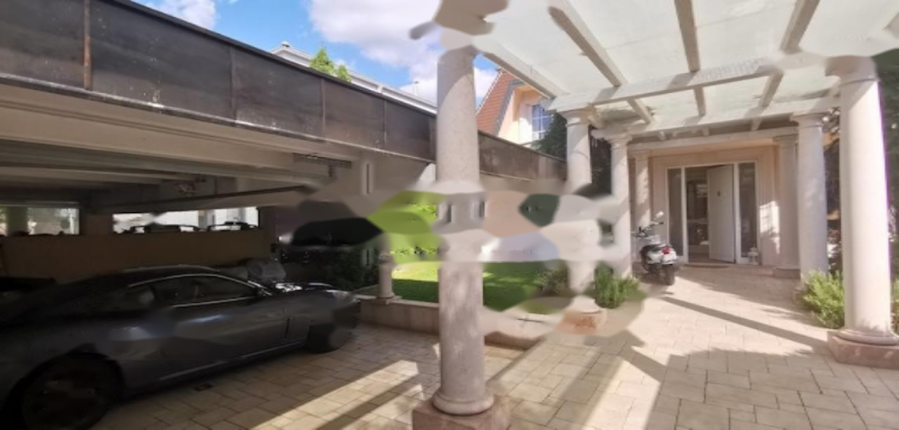 Внешний вид виллы выделяется массивными каменными столбами и стеклянным навесом у главного входа. Дом оснащён двумя входами, включая отдельный сервисный, что делает его подходящим для семей с обслуживающим персоналом.