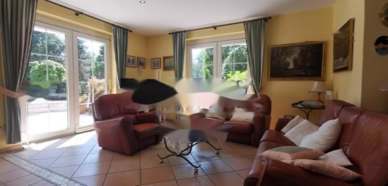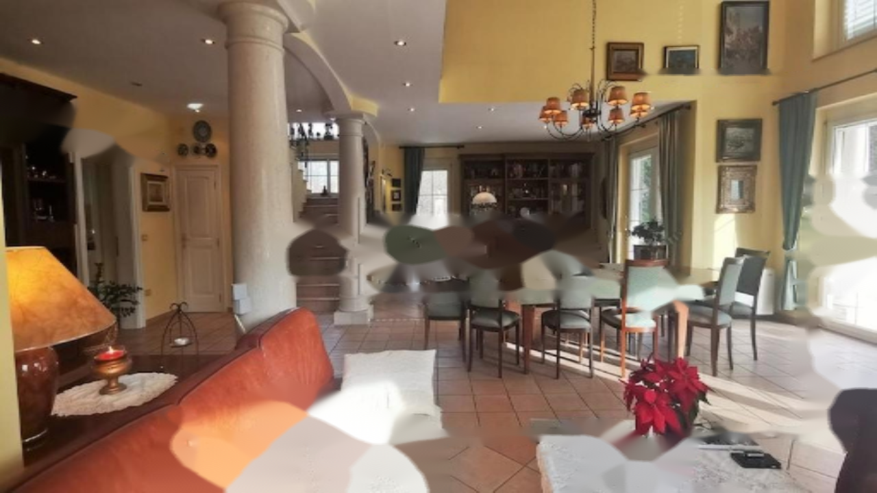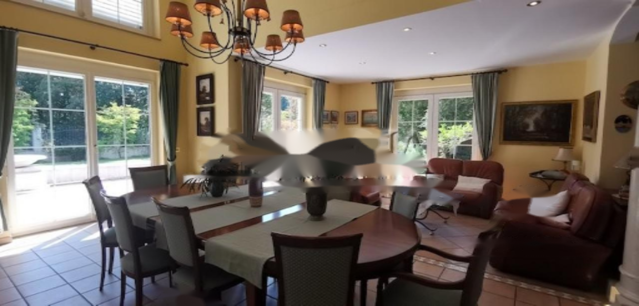 На первом этаже находится просторный холл, большая гостиная с библиотекой и каменными столбами, примыкающая столовая, изолированная кухня, просторная хозяйственная комната и санузел. Через большие окна и двери из всех комнат есть доступ к террасе, с которой открывается вид на окружающий дом лес и лужайки. На террасе расположены заказная каменная фонтан и сад. Вилла ориентирована на восток, юг и запад.