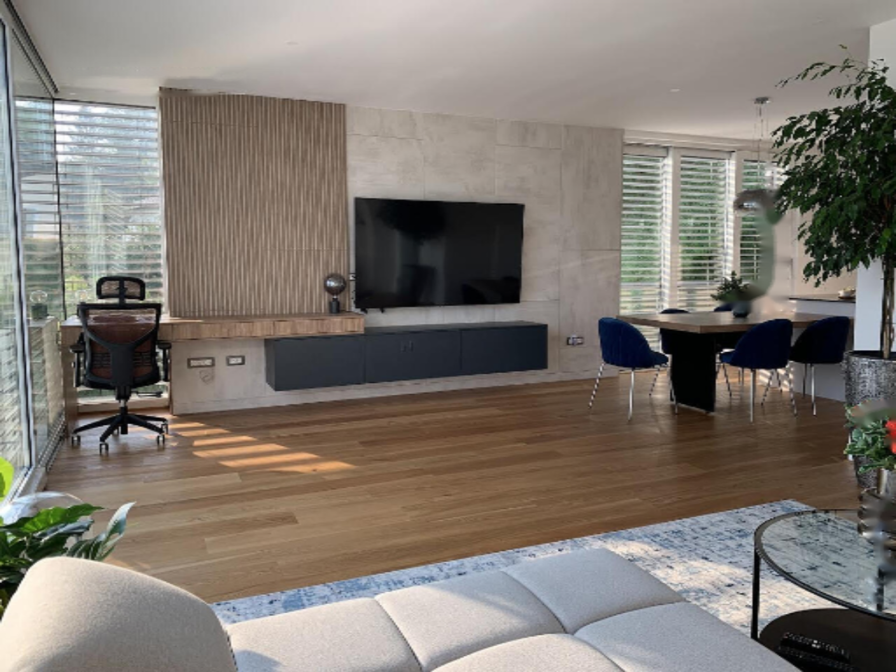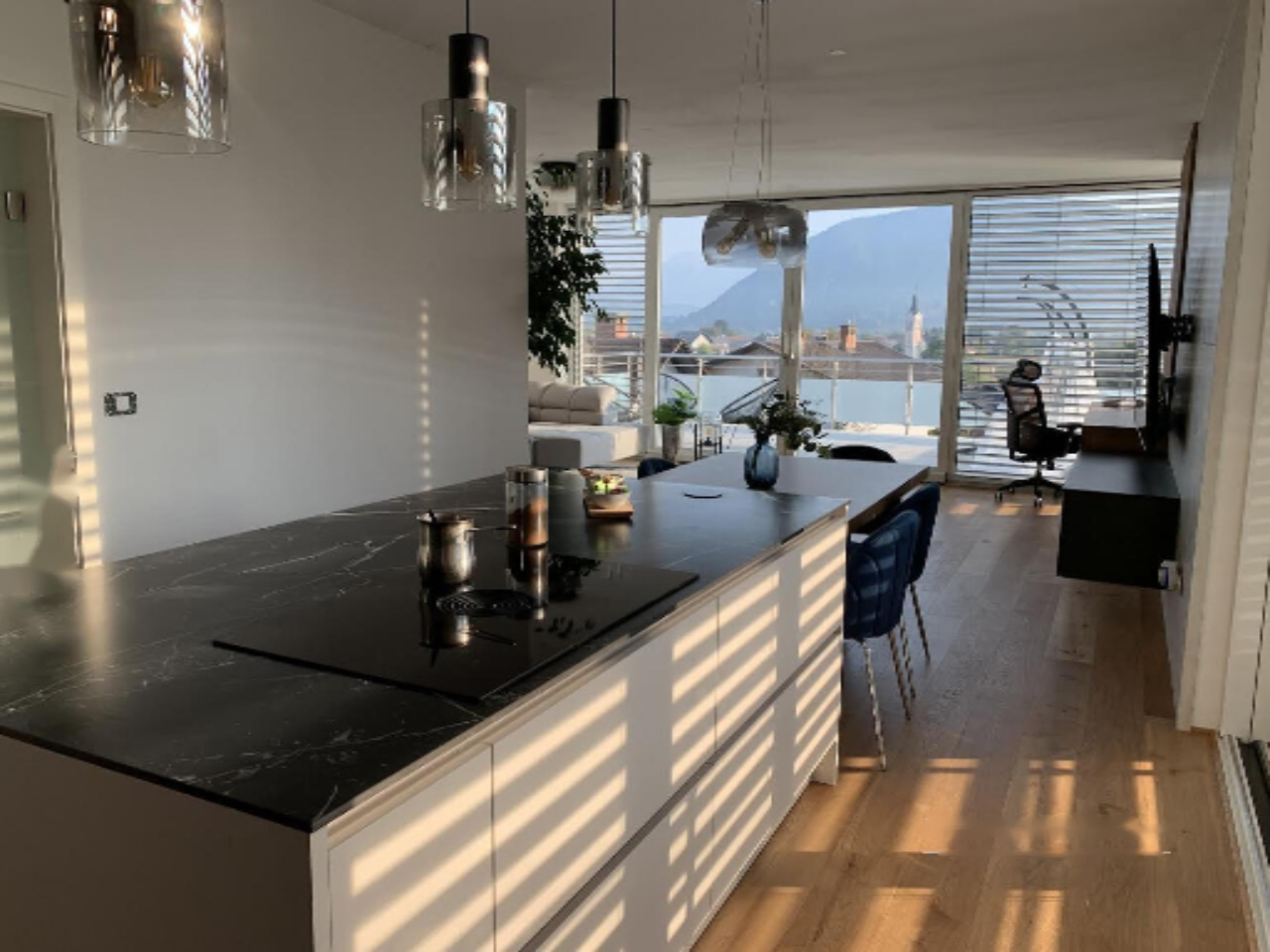 Первый этаж радует светлой гостиной, объединенной с кухней и столовой, с выходом на большой балкон и крытую террасу. Также здесь имеется кабинет, гостевой туалет и спальня с собственной ванной комнатой и гардеробной. ️
