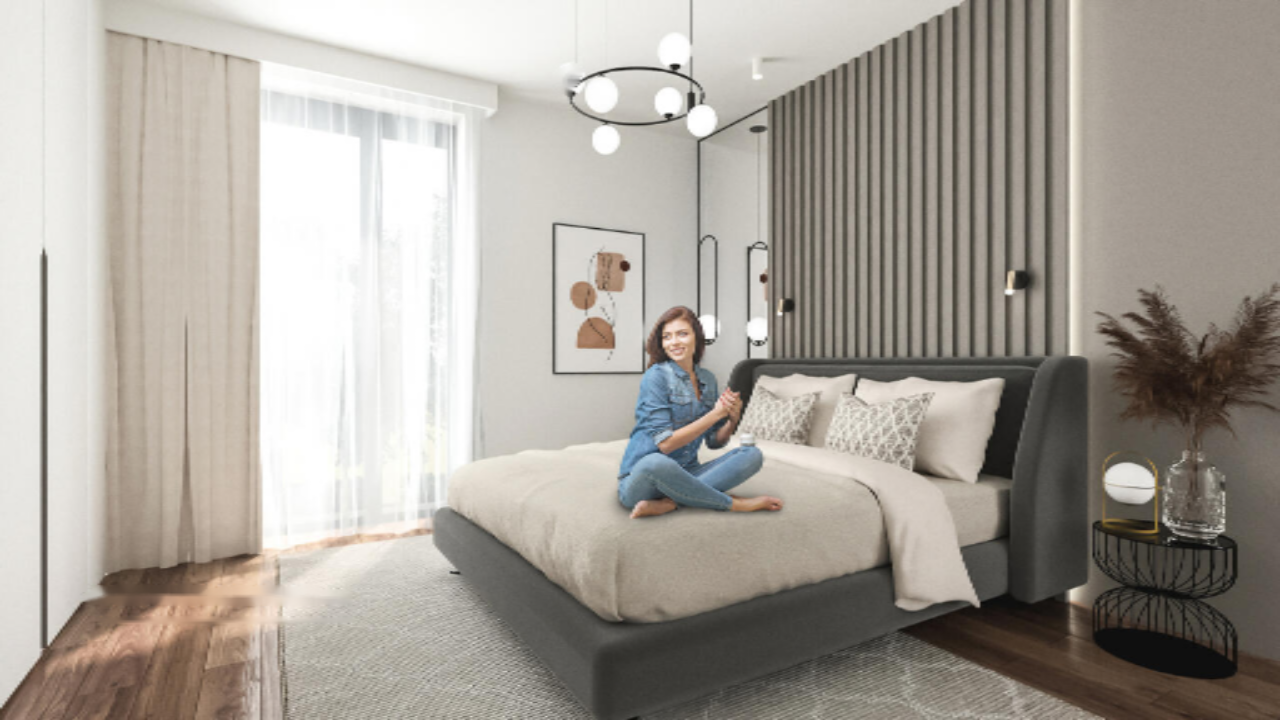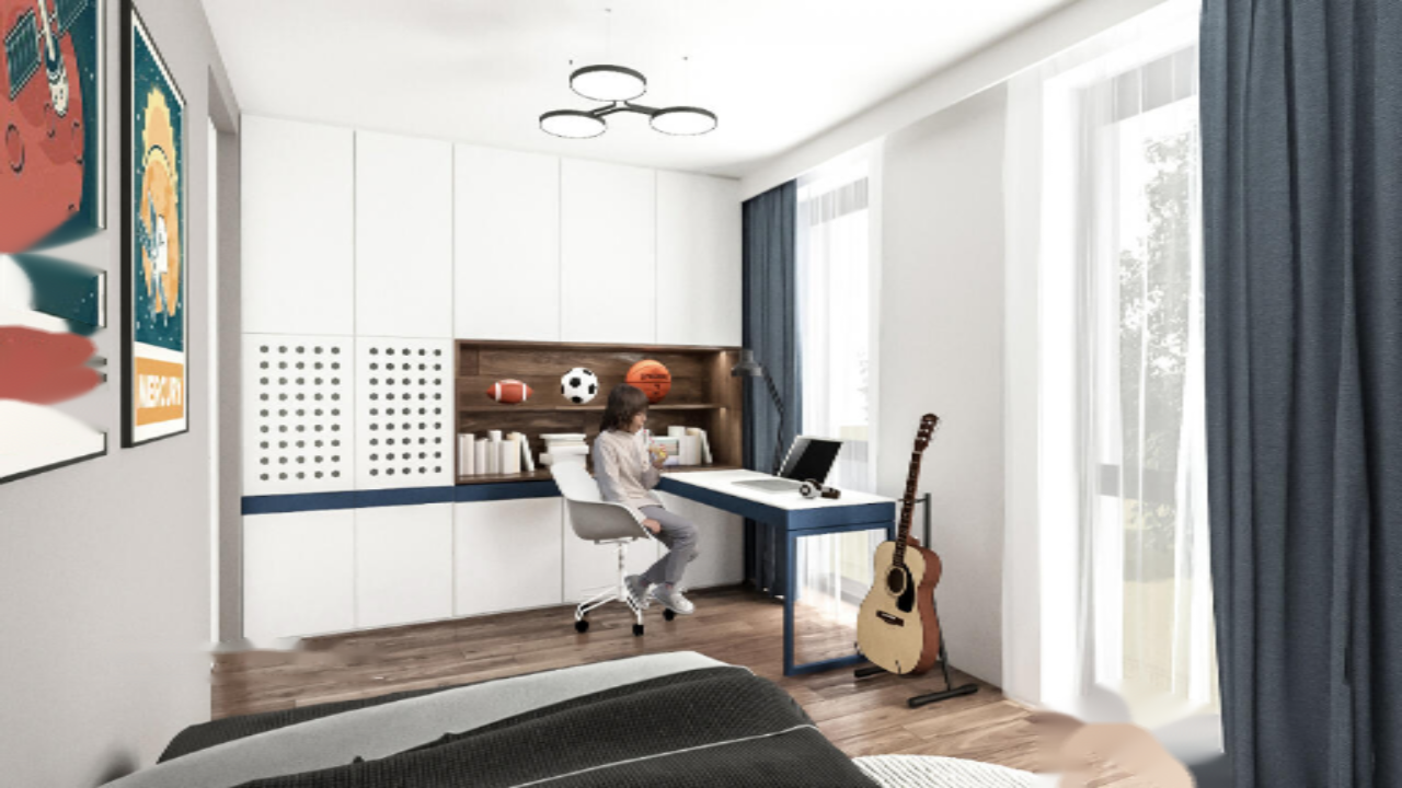 Архитектурное решение внутреннего пространства смоделировано с учетом потребностей семейного образа жизни. Первый этаж включает: прихожую, техническое помещение, санузел, гостиную с кухней и лестницу. На втором этаже расположены: холл с игровой зоной, две ванные комнаты, спальня с гардеробной и две детские комнаты. Гибкий план помещений предоставляет возможность создания третьей детской комнаты .