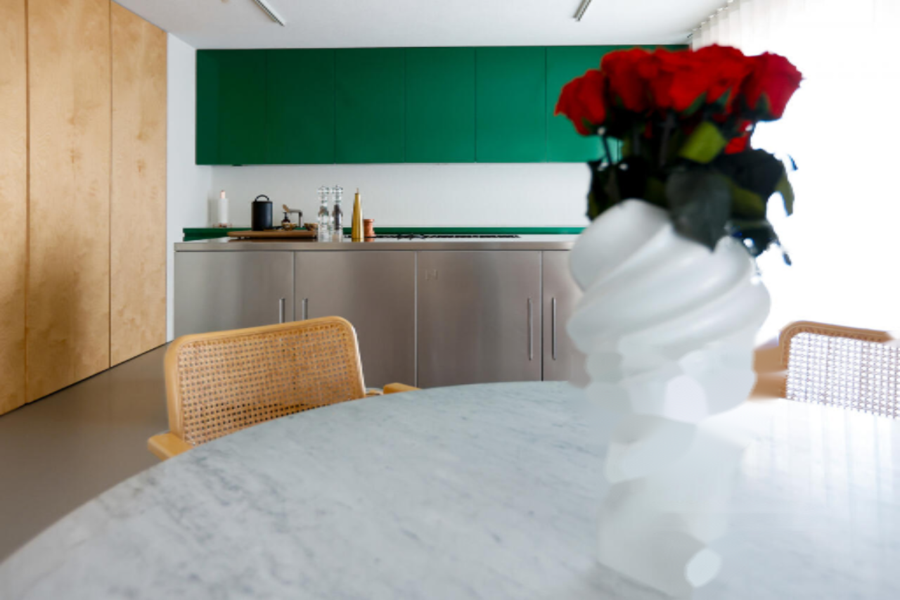 Терраса включает в себя просторную гостиную с выходом на большую внешнюю террасу площадью 83 м², оснащенную летней кухней и защищенную навесом. Оригинальность планировки подчеркивается дизайнерской мебелью по заказу, включающей мраморный обеденный стол и персидские ковры. Эксклюзивные элементы декора и техники - телевизор B&O, индукционная плита и газовая духовка Barazza, а также биокамин в гостиной - создают атмосферу уюта и роскоши.