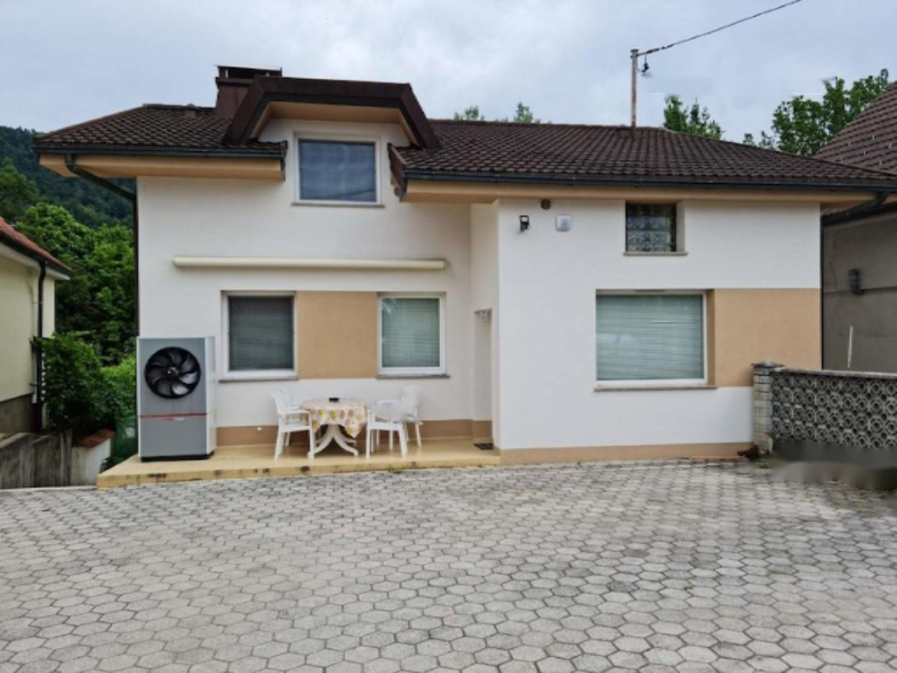 К дому прилегает ухоженный сад с террасой и хозяйственной постройкой. Также имеется просторная парковка на три автомобиля. Для отопления используется современная тепловая насосная система воздух-вода, установленная в 2015 году. Окна выполнены из ПВХ, что было обновлено в 2011 году.