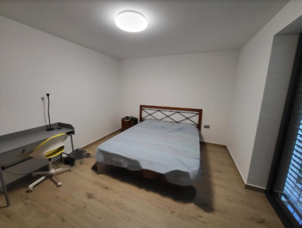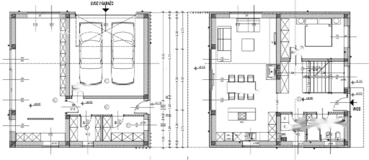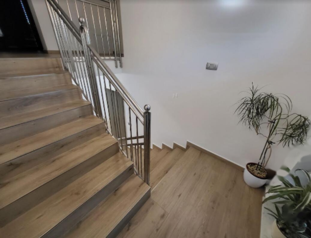 На первом этаже находится входная зона, спальня, кладовая/котельная, ванная комната и жилая зона с кухней. Второй этаж включает две спальни, ванную комнату, просторную гостиную и большую террасу. Также имеется гараж на два автомобиля, кладовая и просторное помещение для хобби.