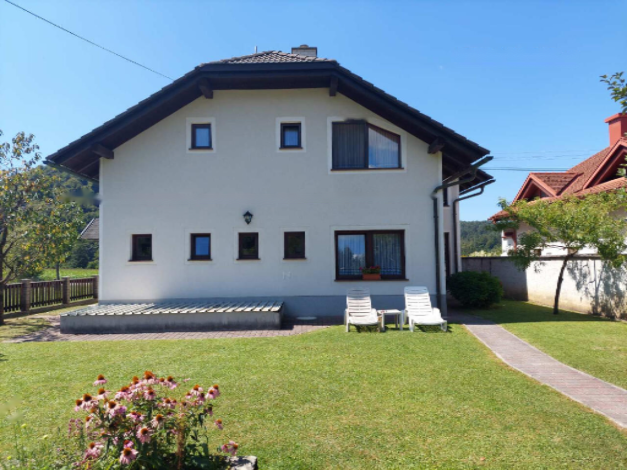 На верхнем этаже расположена просторная и функционально спроектированная квартира с отдельным входом и великолепными видами. Квартира светлая и просторная, включает в себя большую гостиную с кухней и столовой, переходящие на просторную террасу, спальню, две детские комнаты, ванную комнату с душем и отдельный туалет. Отопление осуществляется с помощью пеллет.