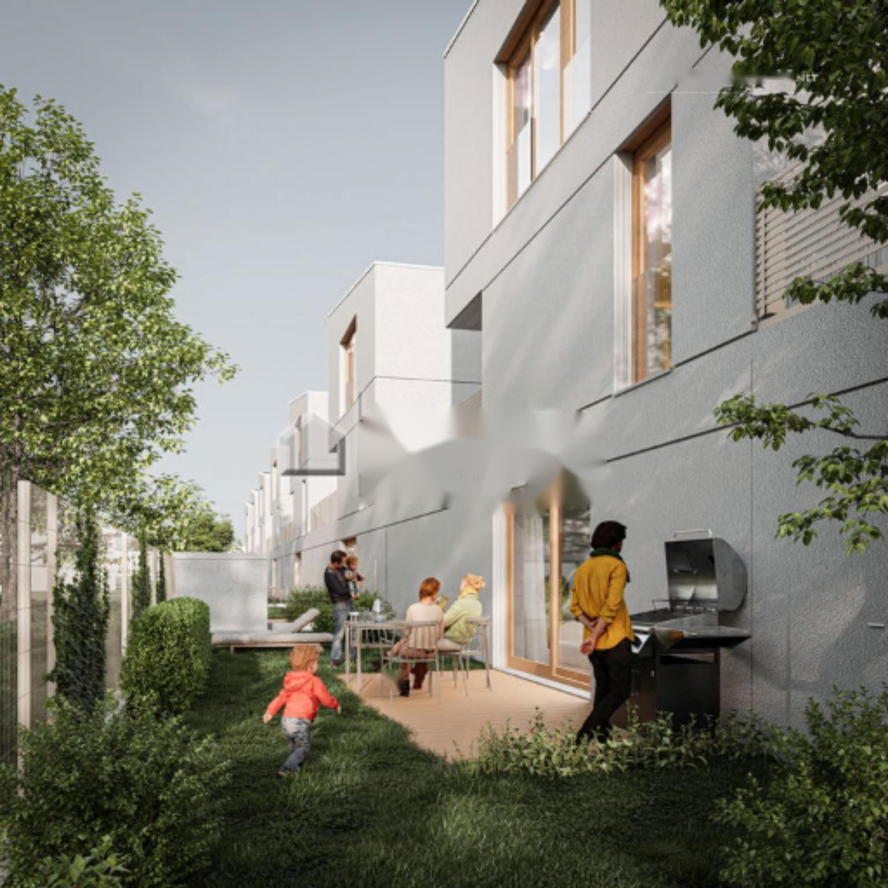 В доме три этажа, каждый из которых тщательно спланирован для комфортного проживания. На первом этаже находится просторный и светлый входной холл, который тонко отделён стеклянной стеной от главной жилой зоны. Здесь есть удобная дневная туалетная комната, под элегантными двухмаршевыми лестницами. Основное пространство этажа объединяет светлая гостиная и столовая, предлагая уютное место для общения. Кухня, аккуратно скрытая в углу дома, отличается приватностью и функциональностью. Во дворе оборудована деревянная терраса, идеально подходящая для детских игр, приготовления блюд на свежем воздухе или отдыха на солнце.