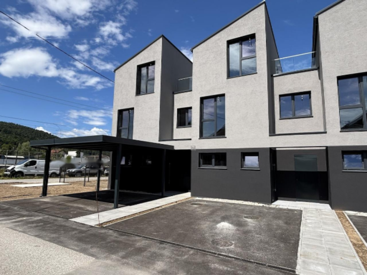 Перед домом предусмотрено место для парковки двух автомобилей . Из технических особенностей можно выделить использование блоков ISOSPAN с встроенной 22-сантиметровой теплоизоляцией, трёхслойные ПВХ окна с электрическими жалюзи и подготовкой для москитных сеток, а также алюминиевые входные двери с открытием по отпечатку пальца. Установлена панельная ограда вокруг дома и участка для сада.