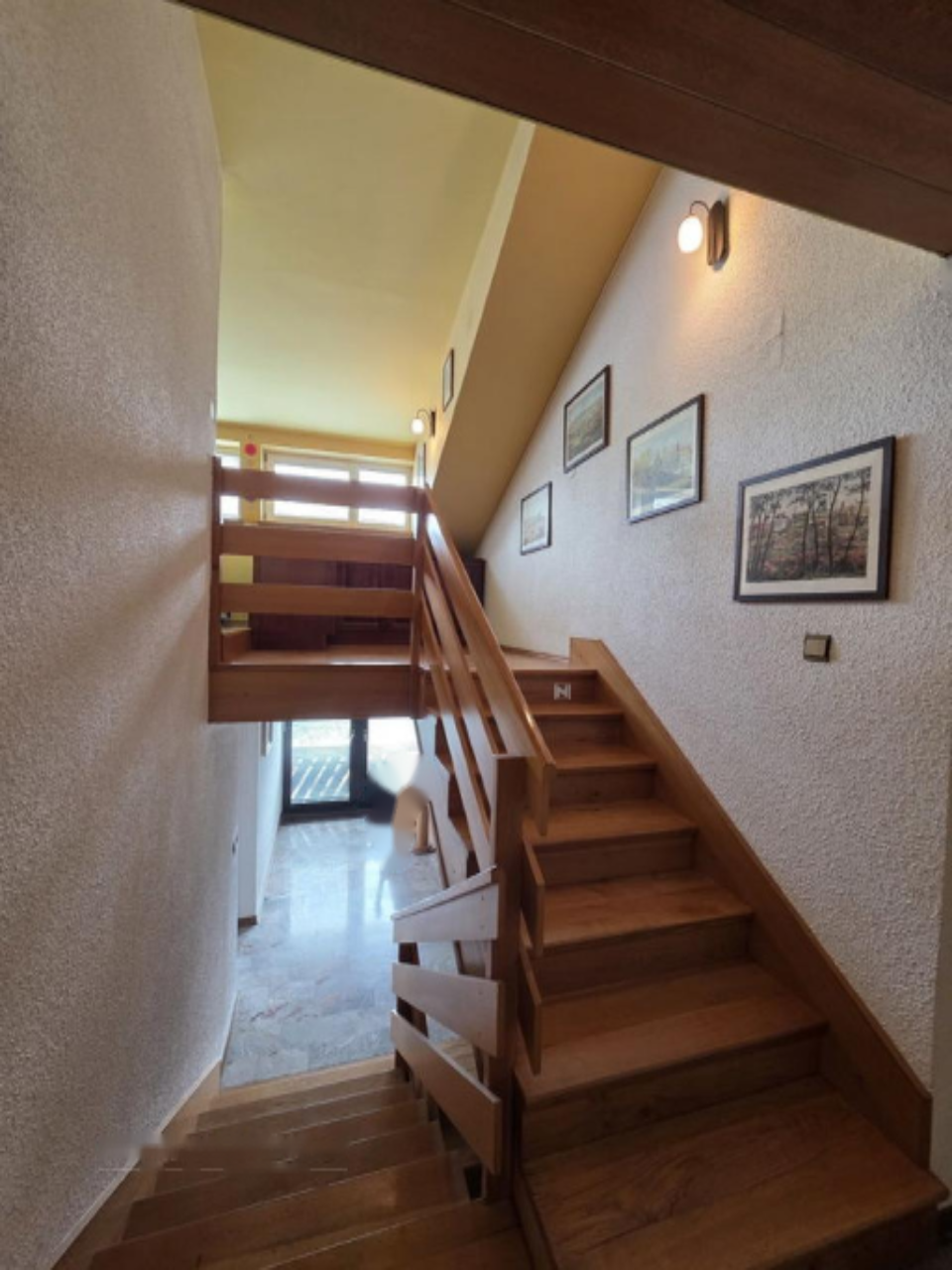 Структура дома состоит из медового этажа, включающего просторную прихожую, гараж с котельной и кладовой с винным погребом. Нижний уровень также включает ванную с ванной, хозяйственное помещение, дневную комнату с выходом на террасу и кухню с столовой. Основной этаж дополнен двумя спальнями, в одной из которых имеется ванная комната с душевой кабиной, и кабинетом. Общее количество спален и ванных комнат — 3.