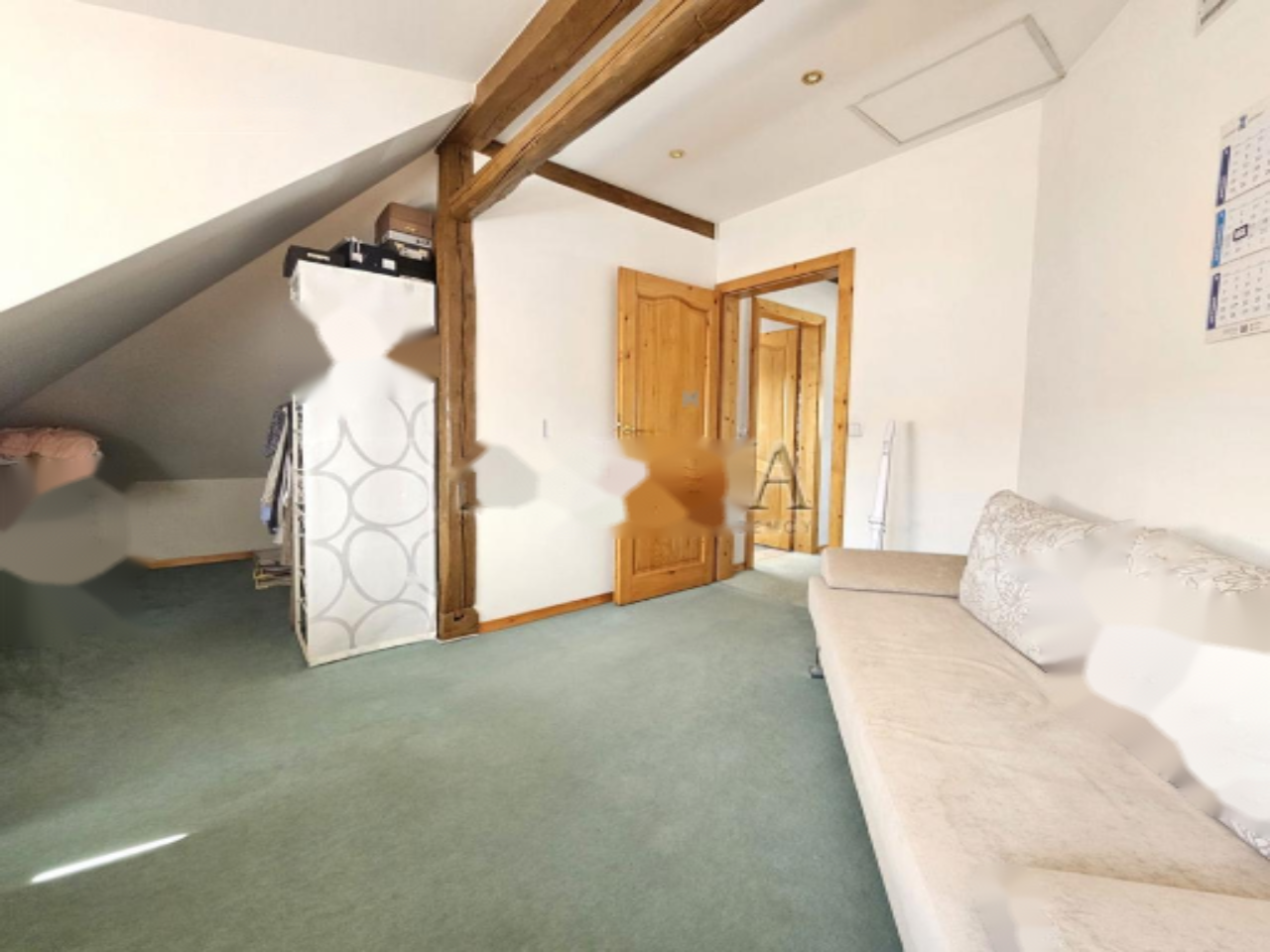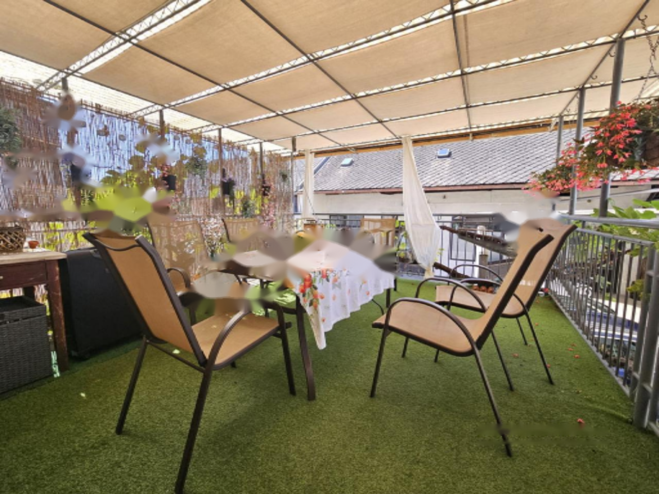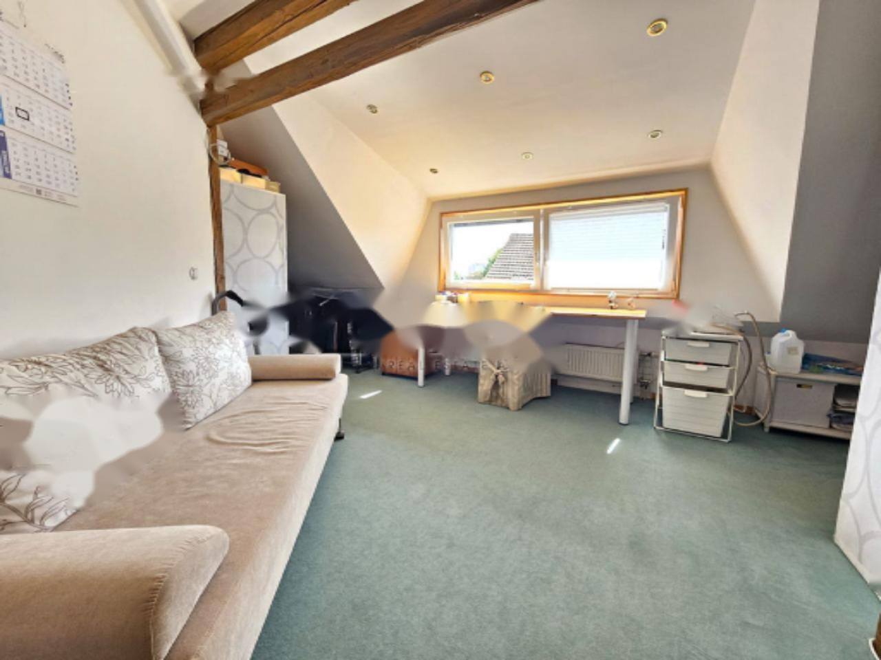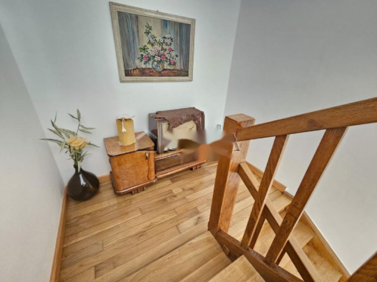 Дом включает в себя подвал, первый этаж, второй этаж и мансарду. В подвале размещены спальня, ванная комната, дневная зона, техническое помещение и гараж. На высоком первом этаже находится современная 3-комнатная квартира с выходом на просторную террасу, ориентированную на запад для максимального дневного освещения. Верхние этажи занимают ещё одно 3-комнатное жилое помещение. В доме имеются пять спален. Также присутствует дополнительный вспомогательный объект площадью 153,8 м², который может быть использован как мастерская или большая гаражная зона.