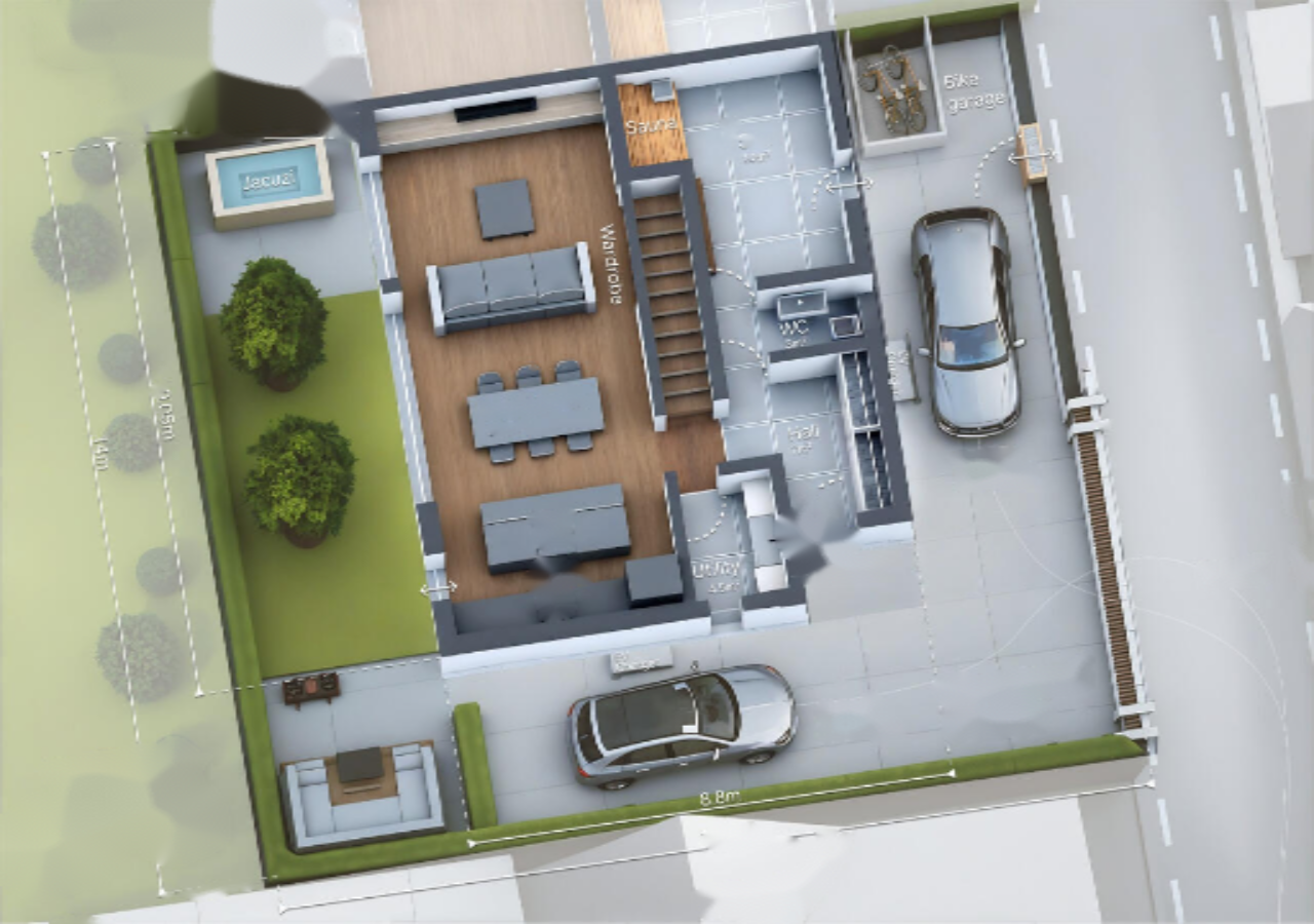 Из дома открывается доступ к ухоженному саду, идеально подходящему для террасы или летней кухни. Также предусмотрены два парковочных места с электрозарядной станцией и подключением для мойки автомобиля.