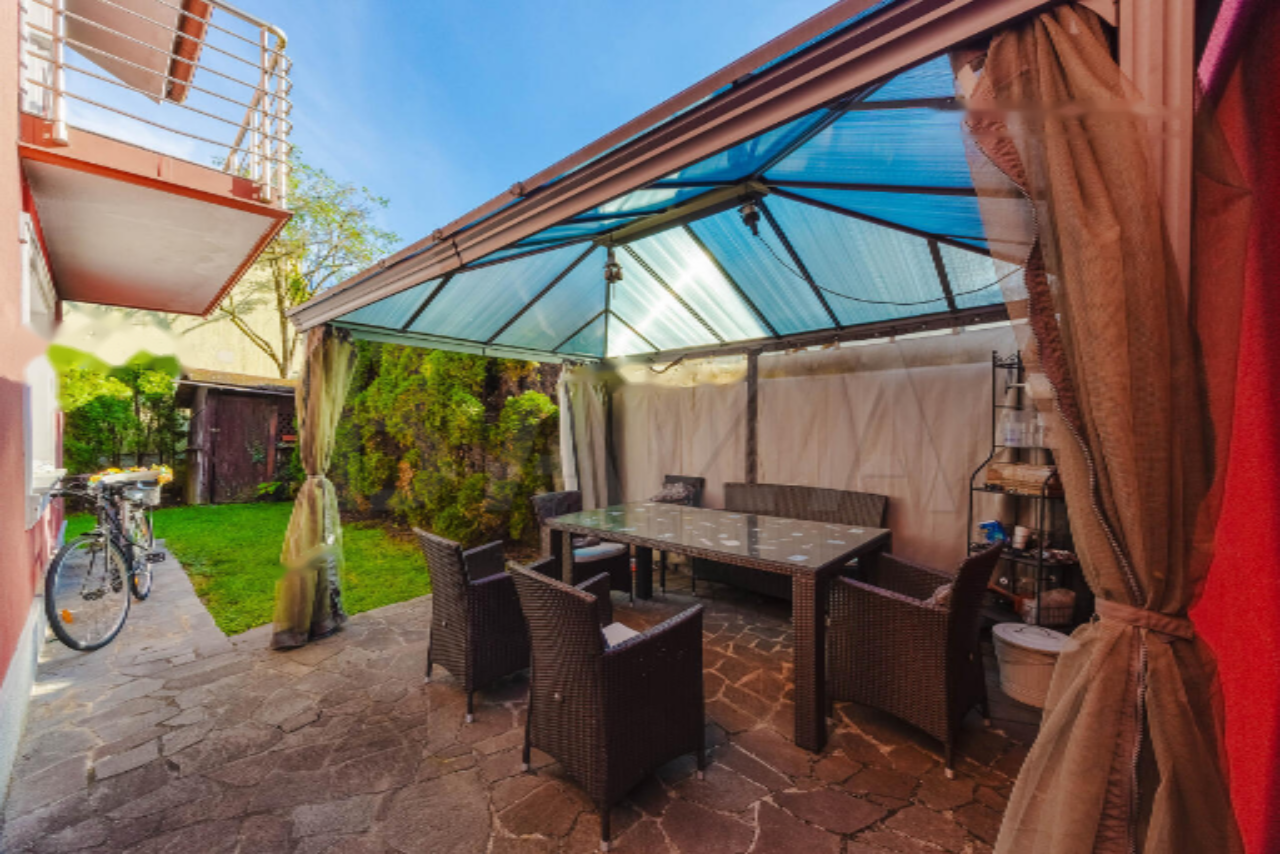 Имеется собственная гаражная площадь 25 м² и ухоженный сад. Дом обладает практичным внутренним сообщением между этажами, а также выделены отдельные входы на первый и второй этажи, что позволяет использовать его как две раздельные жилые единицы.