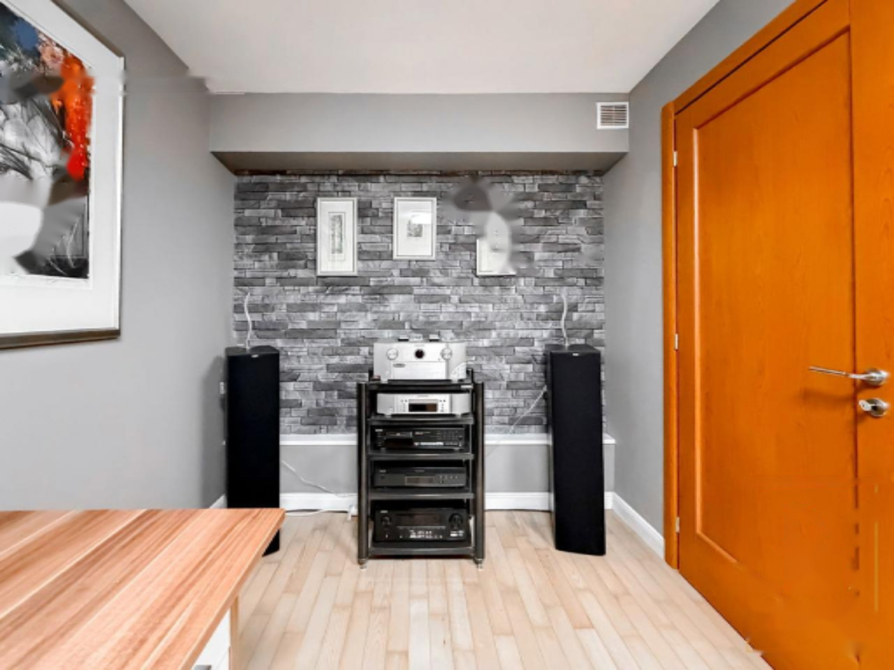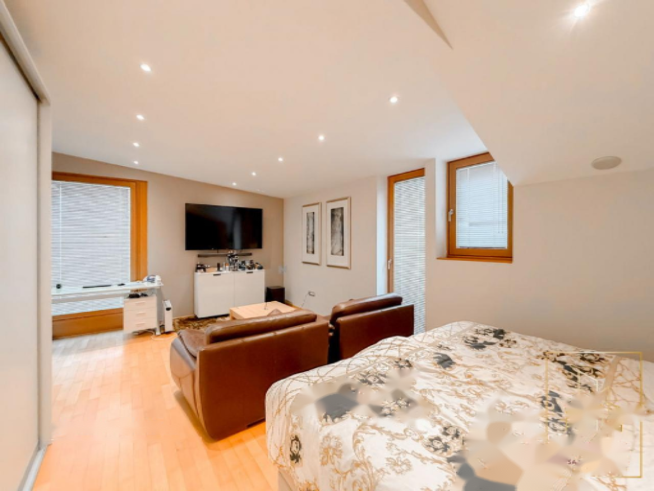Функциональная планировка включает следующие помещения: в полуподвале — помещение для хранения велосипедов, мастерская, офис, зона wellness с массажной ванной на шесть человек, душем и подготовка для двух саун, музыкальная/кино-комната. На межэтажах — главный вход и гардероб. В высоком цокольном этаже — две спальни, детская комната, две ванные, холл и крытая терраса.