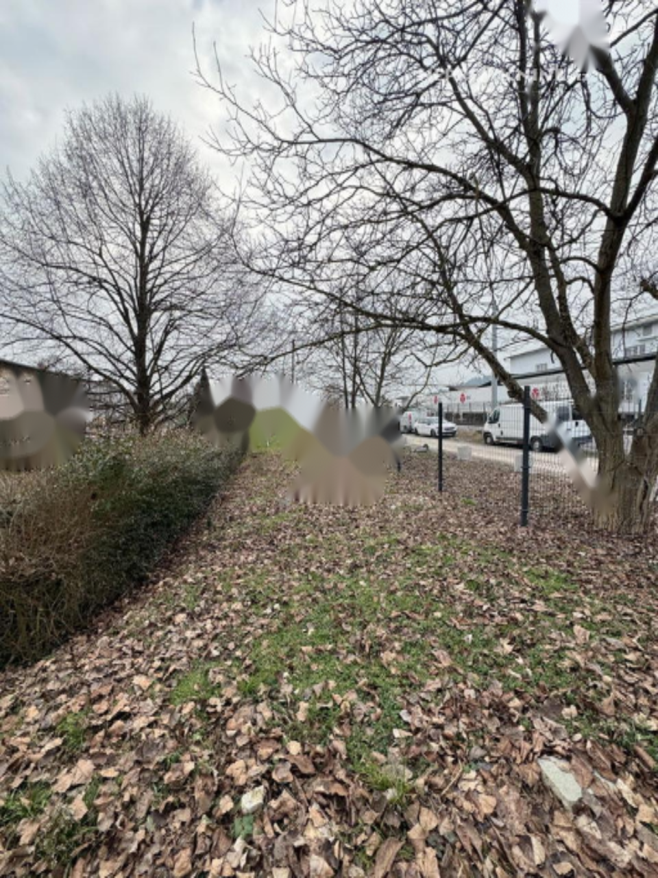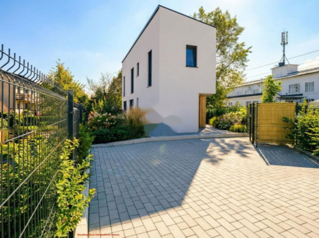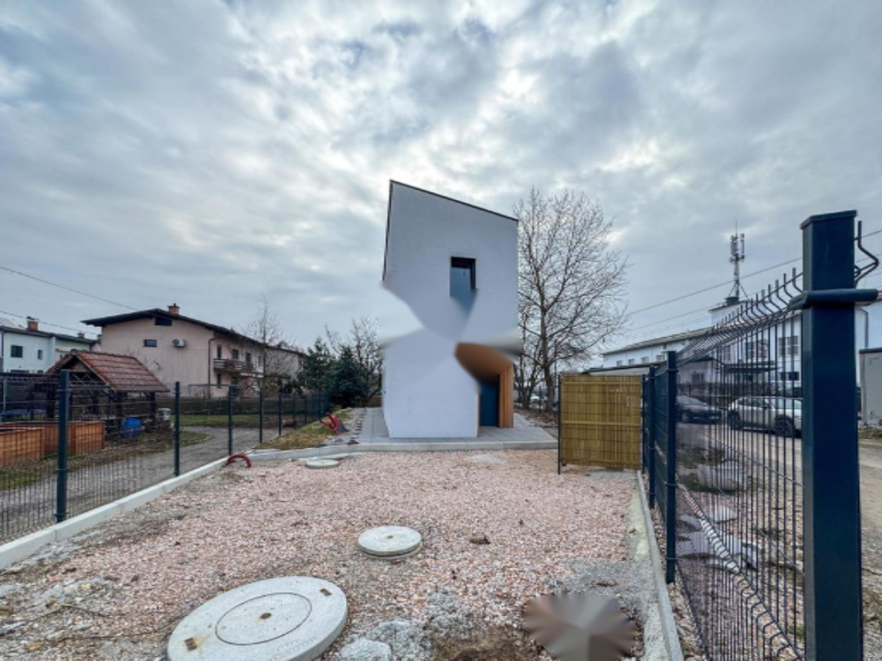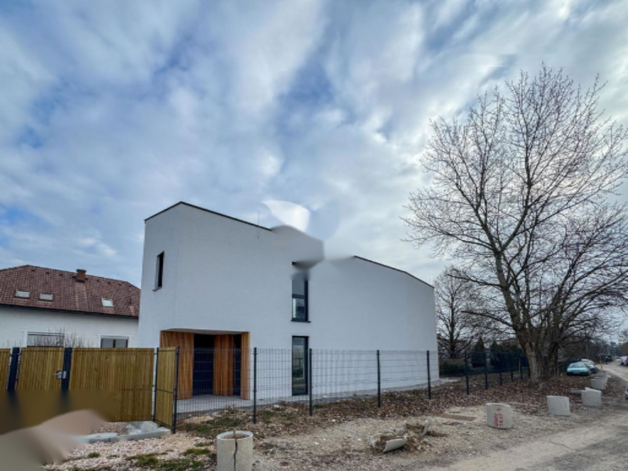 Участок ровный и усажен деревьями, создавая естественную границу. Восточная сторона прилегает к детской площадке, организованной для новых соседей. Перед домом организована парковка на два-три автомобиля с возможностью установки навеса.