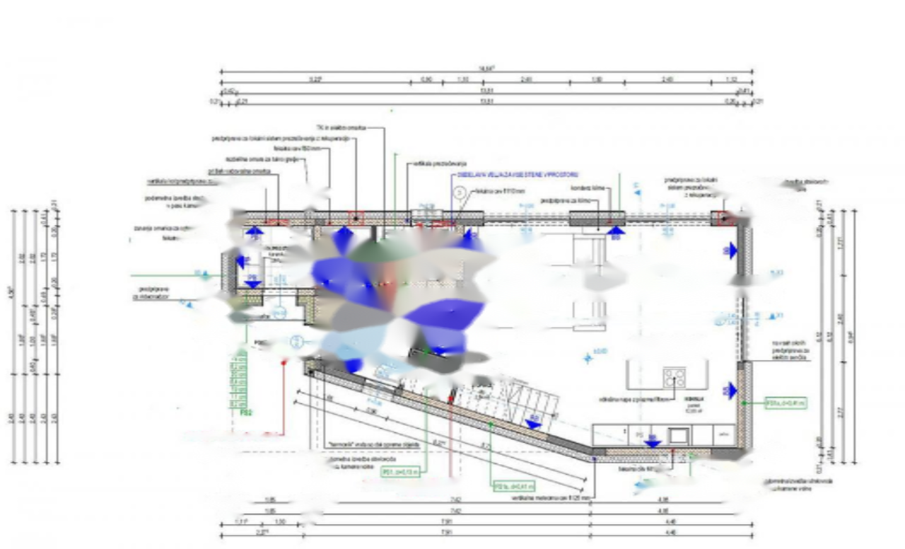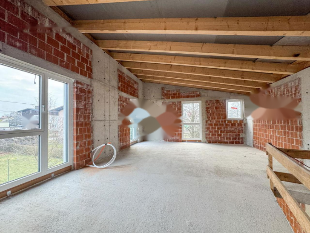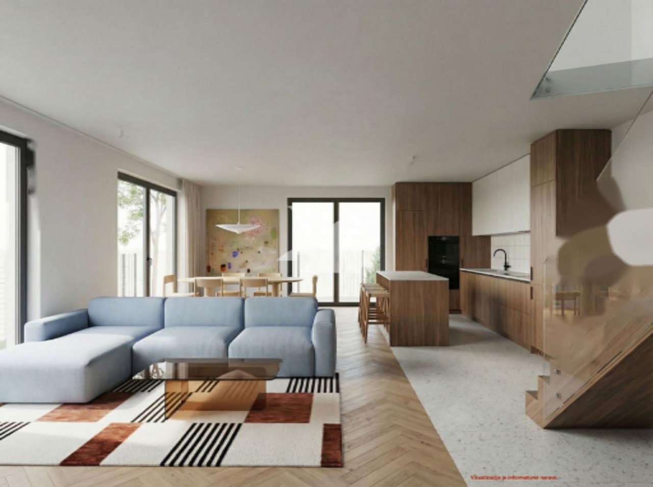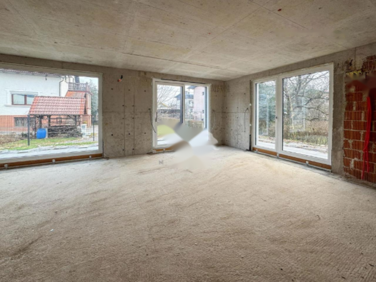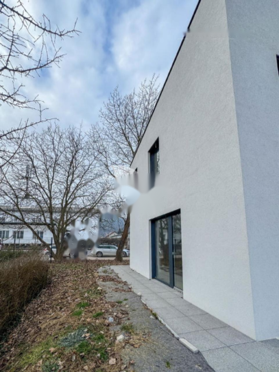 Дом расположен рядом с железной дорогой, однако её воздействие сведено к минимуму благодаря передовой звукоизоляции. На первом этаже предусмотрены прихожая с гардеробом, просторная гостиная с кухней и столовой, ванная комната и техническое помещение с наружным доступом. Кухня большая, с местом для острова. Из просторного остеклённого зала есть выход на террасу и в сад.