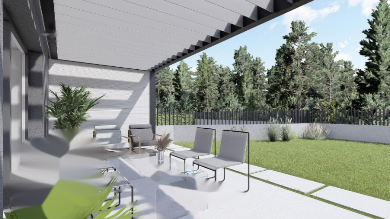 Архитектурное решение предполагает размещение на первом этаже жилых помещений с выходом на террасу и одной комнаты, а на втором этаже - спальных зон с ванной комнатой. Дом обладает всеми необходимыми современными удобствами, такими как напольное отопление, тепловой насос, система кондиционирования воздуха, возможность установки зарядной станции для электромобилей и собственная система очистки сточных вод. Подключение к оптоволоконному интернету и вентиляционная система обеспечат комфортное проживание.