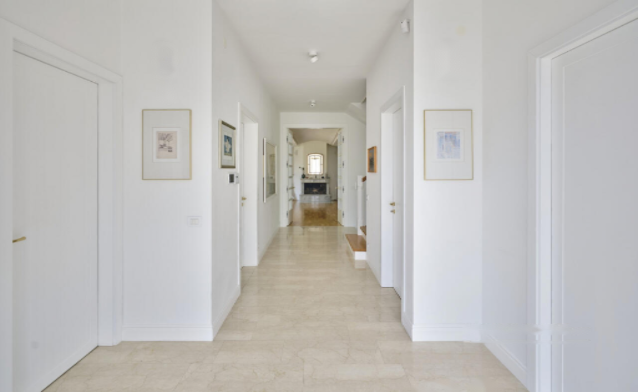 Дом окружен двумя садами и оснащен системой безопасности, включая камеры, сигнализацию и электрические алюминиевые рольставни. Высокие потолки — три метра на первом этаже и 2,65 метра на втором — создают ощущение простора и света, тем более, что размер окон в кухне, ориентированной на юг, способствует этому. Подогрев полов и мраморная отделка создают атмосферу уюта и роскоши, а центральное отопление работает на природном газе. В доме также установлено кондиционирование.