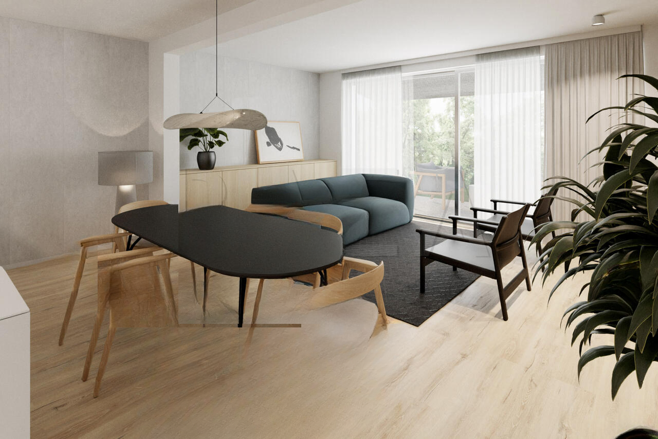 На первом этаже расположены: прихожая, кладовая/техническая комната, отдельный туалет, а также просторная гостиная с кухней и столовой, соединенная с террасой и садом через большие стеклянные двери. Второй этаж включает три спальни, коридор и две ванные комнаты с туалетом. На мансарде находится дополнительная спальня, коридор и ещё одна ванная комната с туалетом.
