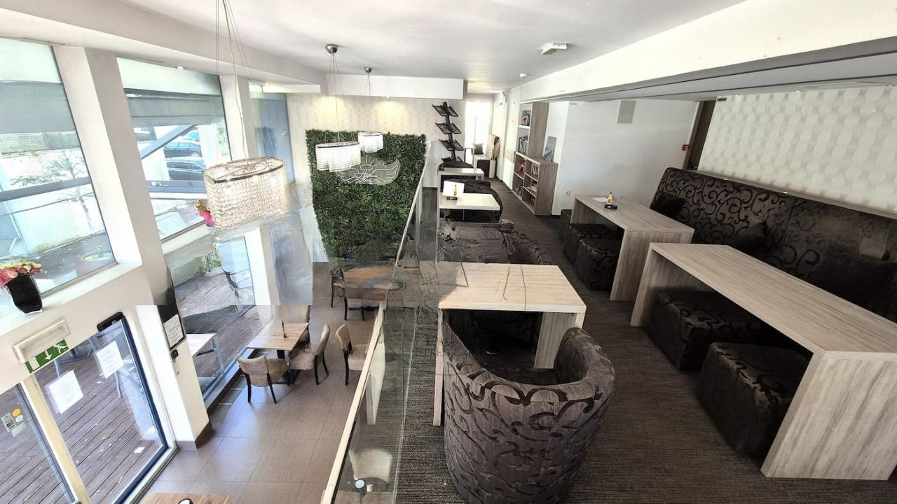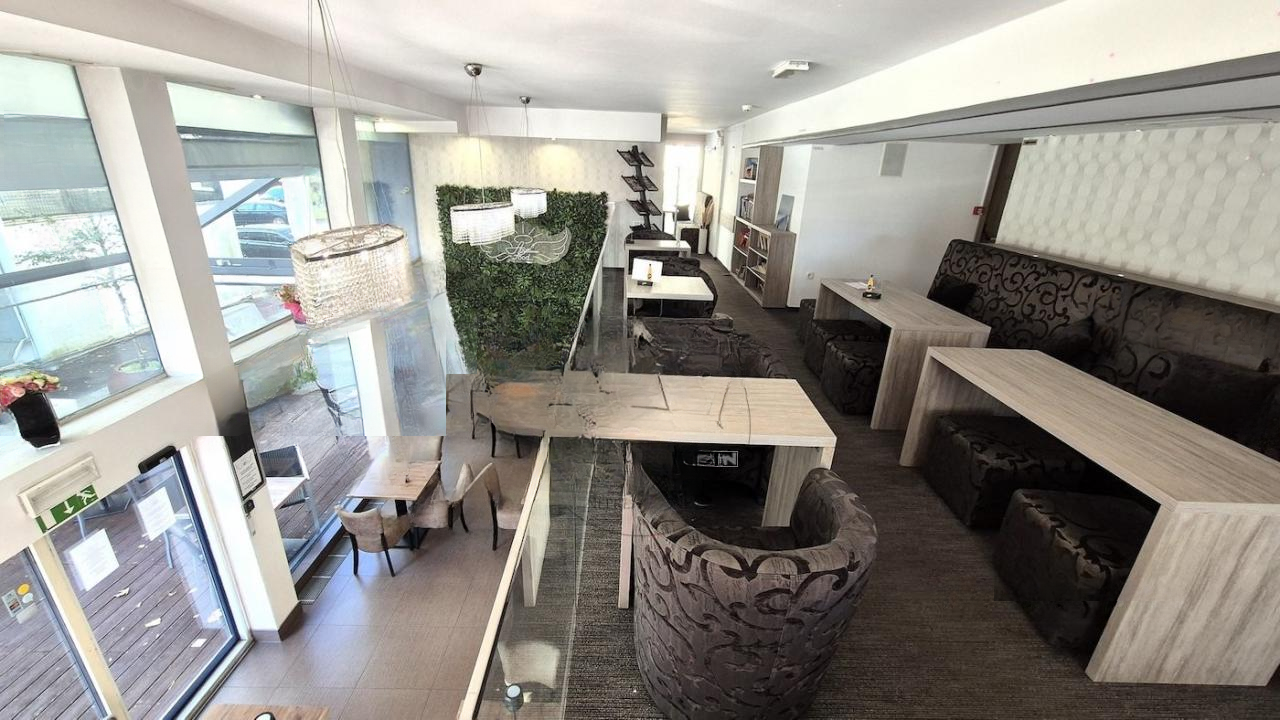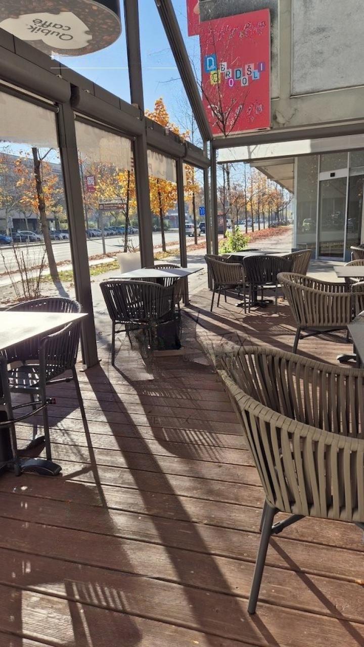 Кафе имеет внешний террасный участок с примерно 30 местами, крытую надстройками, а также внутренние сидячие места. Из окон второго этажа открывается вид на одну из центральных улиц — Дунаjска дорога, что добавляет привлекательности для посетителей.