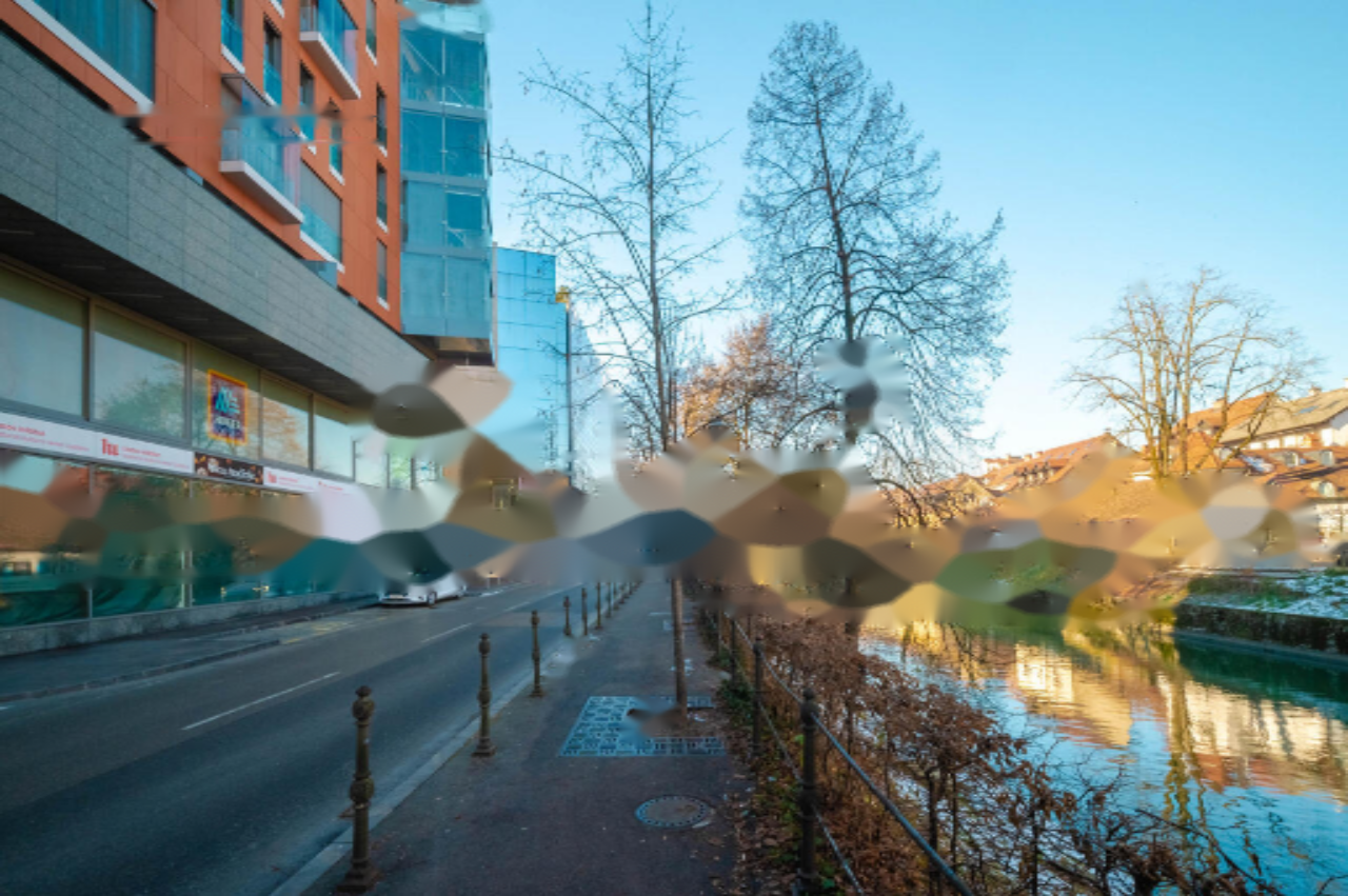 Объект отличается современным дизайном и выставочными окнами, ориентированными на север и запад, с видом на реку Любляницу. Окна в настоящее время временно закрыты легкими перегородками, которые при необходимости могут быть удалены. Включает выставочную/торговую зону, гардероб, санузлы, помещение для кухни и складскую зону.
