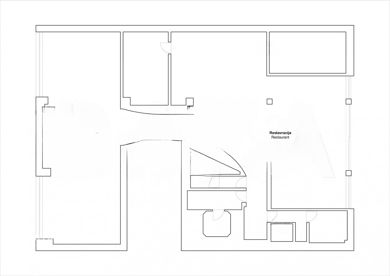 Уникальная архитектурная особенность состoит в наличии двух отдельных пространств на первом этаже, где размещены кухня и склад. Основная зона для посетителей располагается на первом этаже и включает барную стойку, кухню, грузовой лифт, складское помещение и туалеты. Также в наличии просторная терраса, использование которой согласовано с муниципальными властями. В подвале обустроены бар, зал, комната, двойные санузлы и небольшая кино-комната.