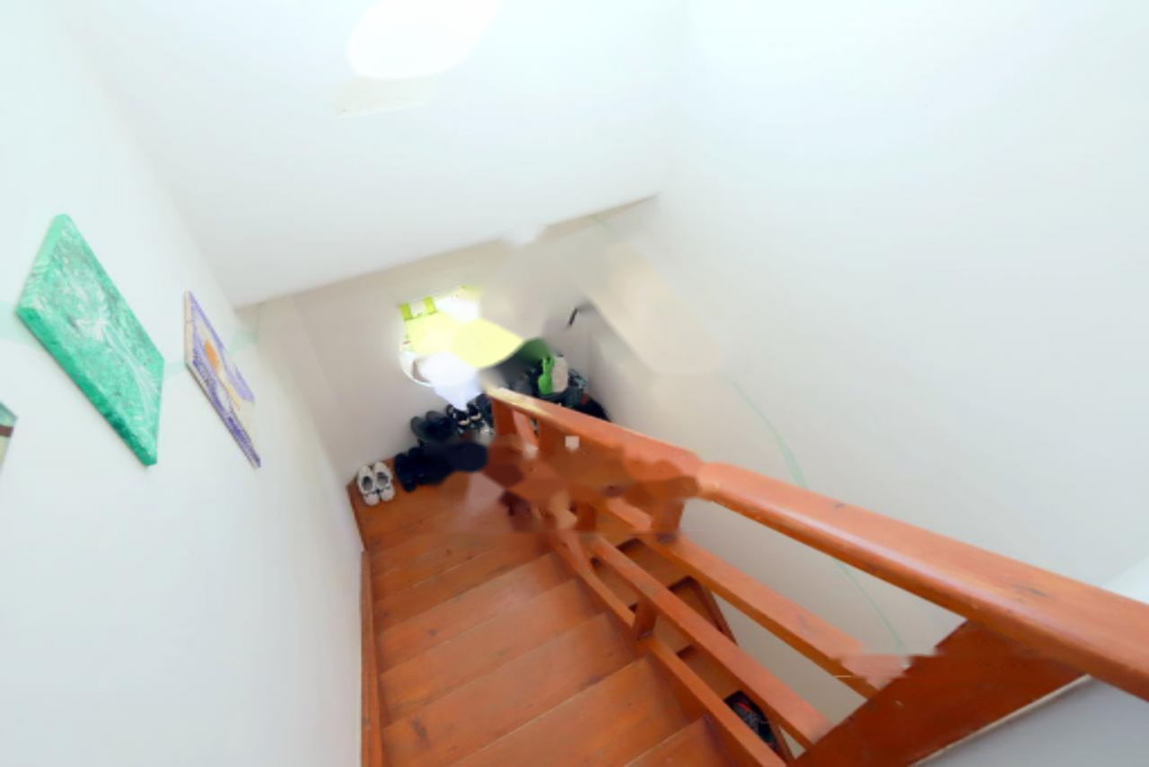 Дом разбит на два отдельных жилых пространства с раздельными входами. На первом этаже находится двухкомнатная квартира, имеющая выход на ухоженный сад. На второй и мансардный этажи ведёт внутреннее лестничное пространство, где расположена трехкомнатная квартира, соединённая с террасой.