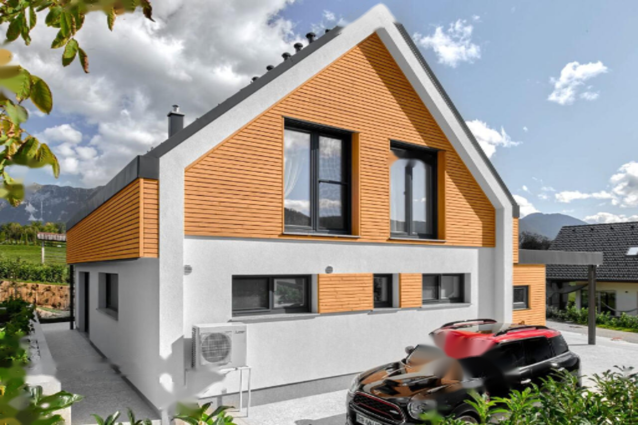 Предлагается современный дом в спокойном поселке Рибно. Площадь дома составляет 168,4 м², участок - 711 м². Двухэтажное строение было возведено в 2022 году, и его эстетика органично вписывается в окружающий пейзаж. Дом обладает террасой, сауной и захватывающим видом на горы.