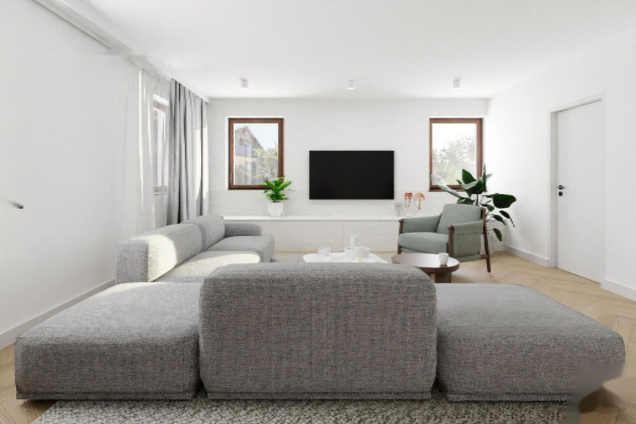Общая площадь дома 308,7 м² с жилой площадью 93,4 м². Конструкция включает подвал, первый этаж и второй этаж. Внешняя визуализация доступна для наглядного представления возможного обновления интерьера и экстерьера.