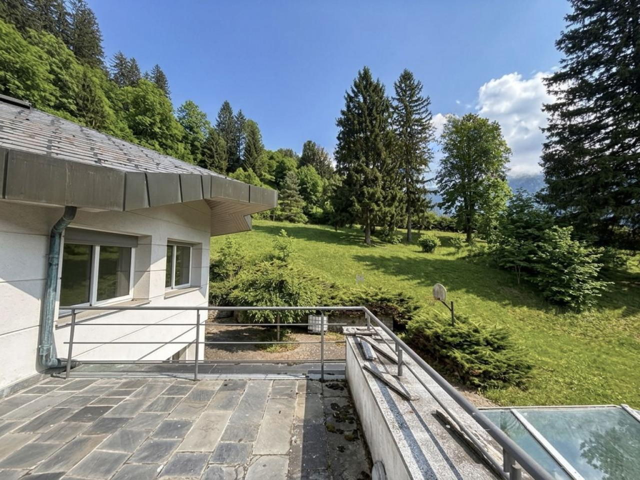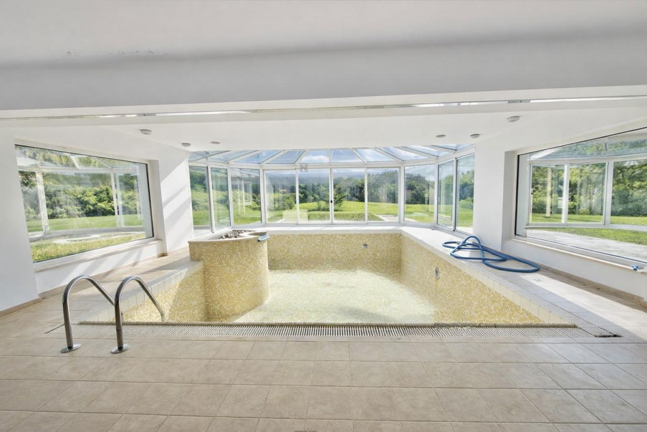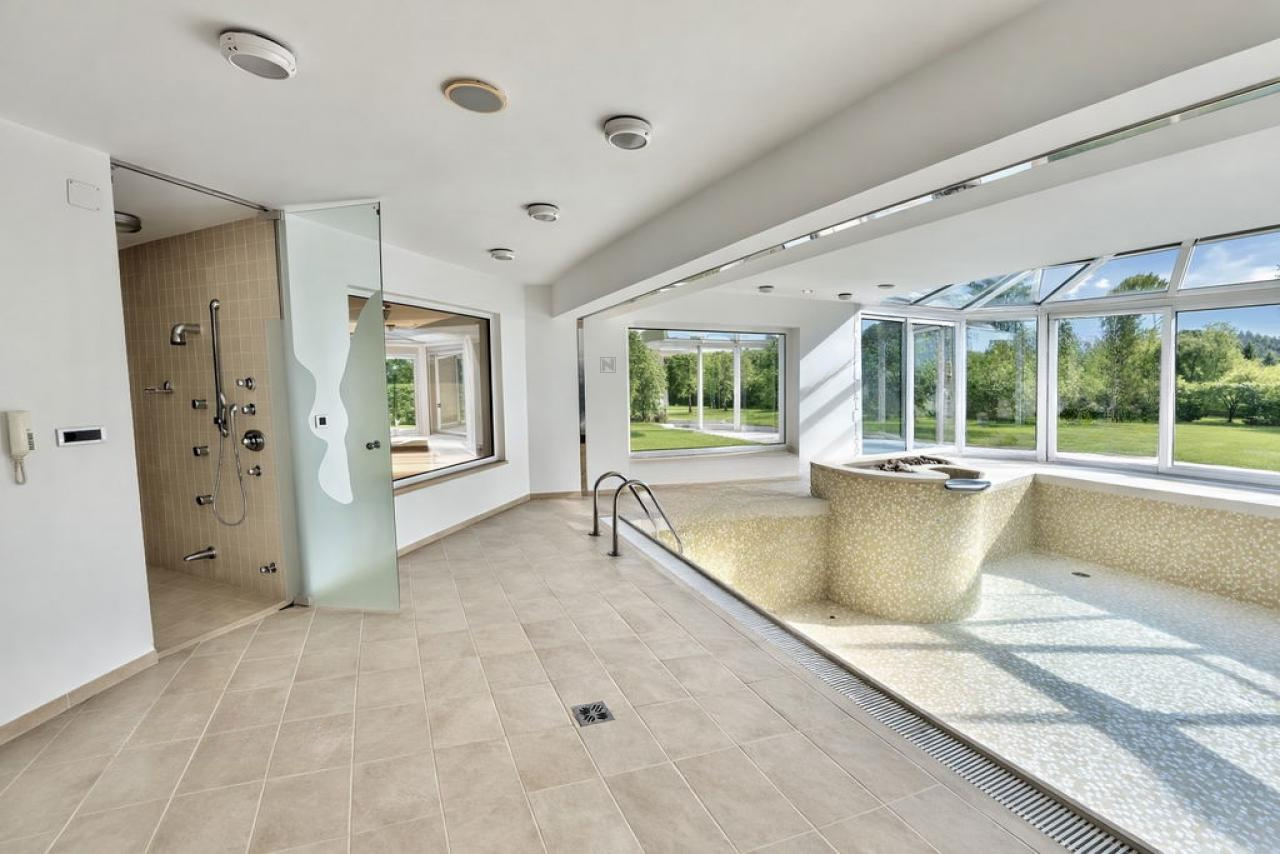 На территории находится просторная вилла, построенная в 1999 году и требующая обновления. Здание выделяется светлыми и открытыми пространствами с панорамными окнами, обеспечивающими обилие естественного света и потрясающие виды на окружающую природу. Особенностью данного объекта является наличие внутреннего бассейна с зоной отдыха и сауной, что позволяет наслаждаться комфортом в любое время года.