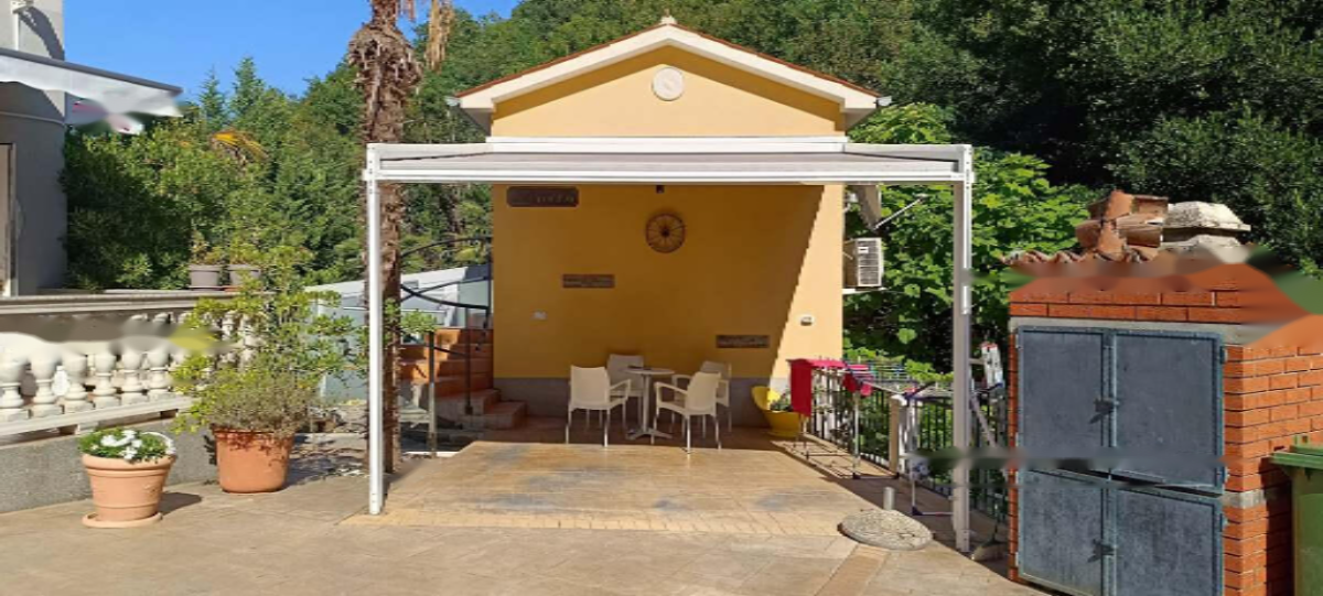 Перед домом расположено вымощенное дворовое пространство с крытой террасой и вместительной парковкой, рассчитанной более чем на 10 автомобилей. Существуют также возможности для расширения за счет строительства двух дополнительных апартаментов общей площадью 50 м².